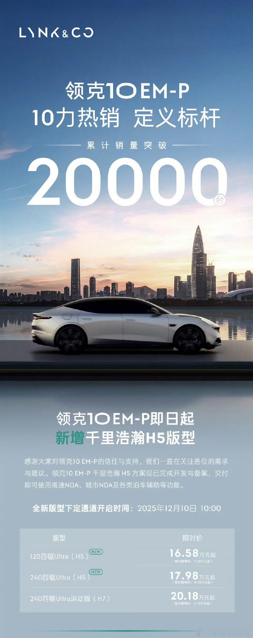 领克10 EM-P在今年9月上市3个月时间累计销量突破2万台今年领克900、10 EM-P的销量都相当出众之前去拍摄领克10 EM-P之后留下几点印象首先就是外观设计非常帅内饰的配置非常高四驱、油电混合的动力配置满足当下消费者的既要又要座椅按摩、车内音响等配置不只是有而且是非常高的配置目前还新增了千里浩瀚H5版型120四驱Ultra H5限时价16.58万元起240四驱Ultra H5限时价17.98万元起新车型交付即可使用高速NOA、城市NOA以及各类泊车辅助等功能又帅又高性价比大v聊车领克10EM-P销量快速突破2万