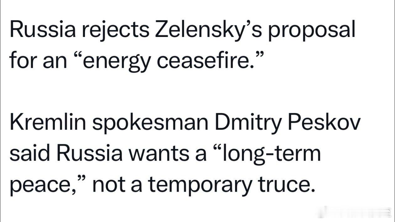 Zelensky提议:双方承诺,不炸能源设施,让百姓过冬克宫发言人:不接受“能源停火”,想要“长久和平”