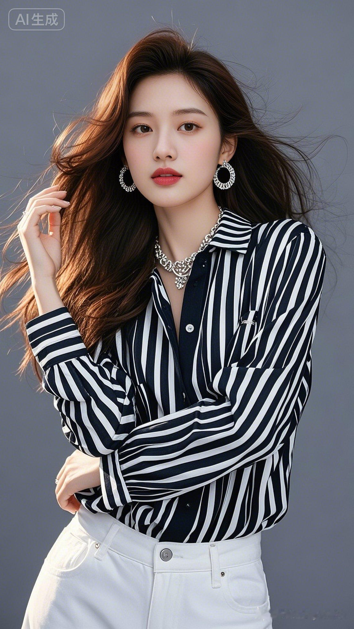 栗棕色长发随风飘动,美女妆容精致,鲜艳红唇配华丽圆形耳饰与项链。黑白条纹宽松衬衫搭白色牛仔裤,时尚前卫,灰色调背景更衬格调。