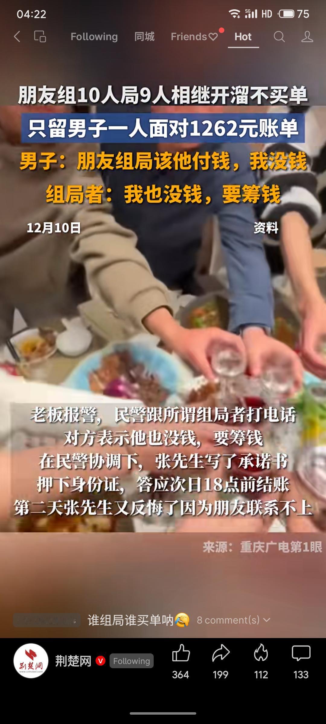 重庆10人聚餐消费1262元,散场后9人相继离开,仅剩张先生被要求买单。张先生与组局者互相推诿,均称无钱支付。经民警协调,张先生写下承诺书后仍反悔。此事暴露部分人缺乏社交诚信与责任意识,也将简单聚餐异化为法律纠纷,反映出现实中维权成本高昂的困境。