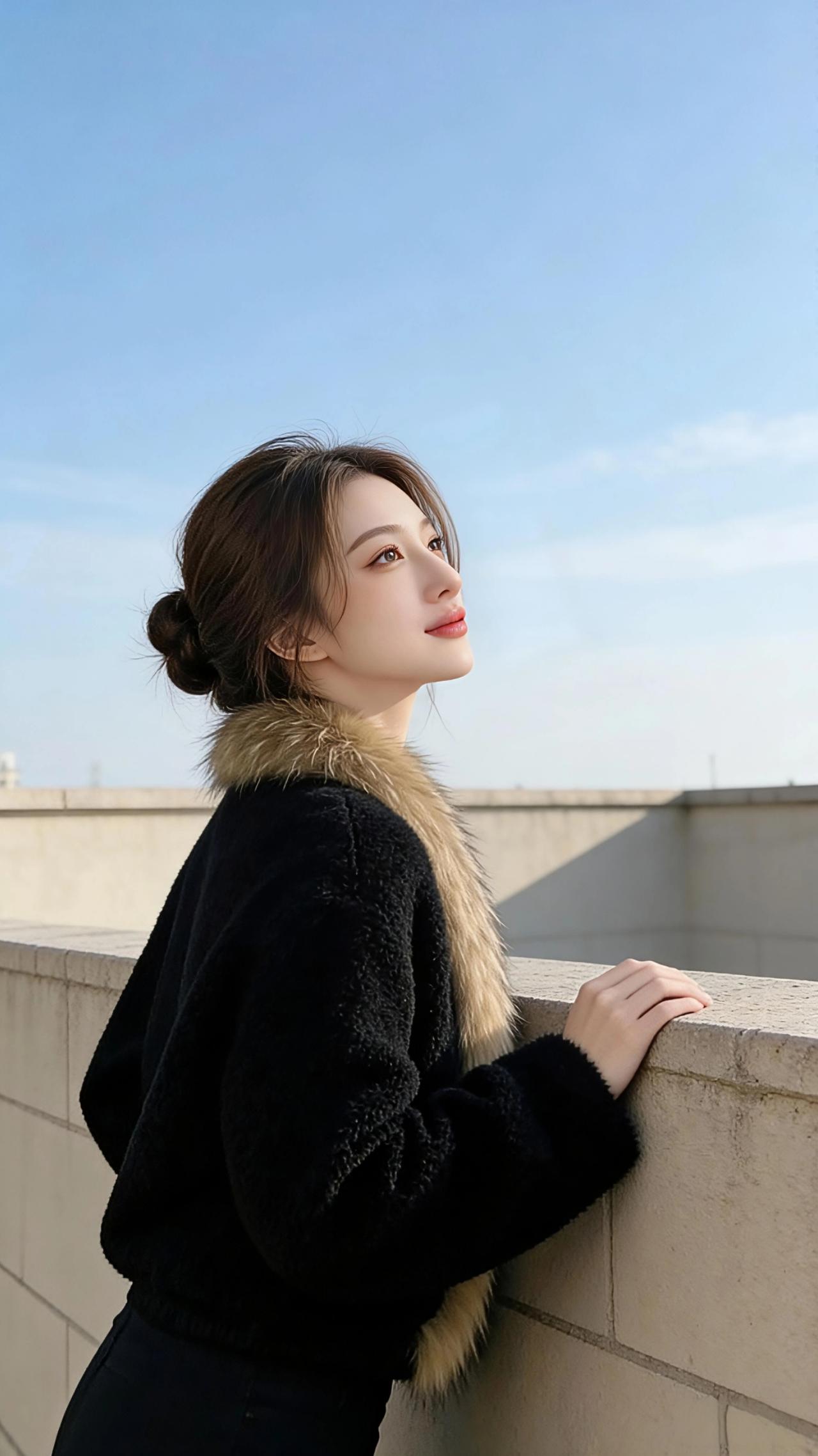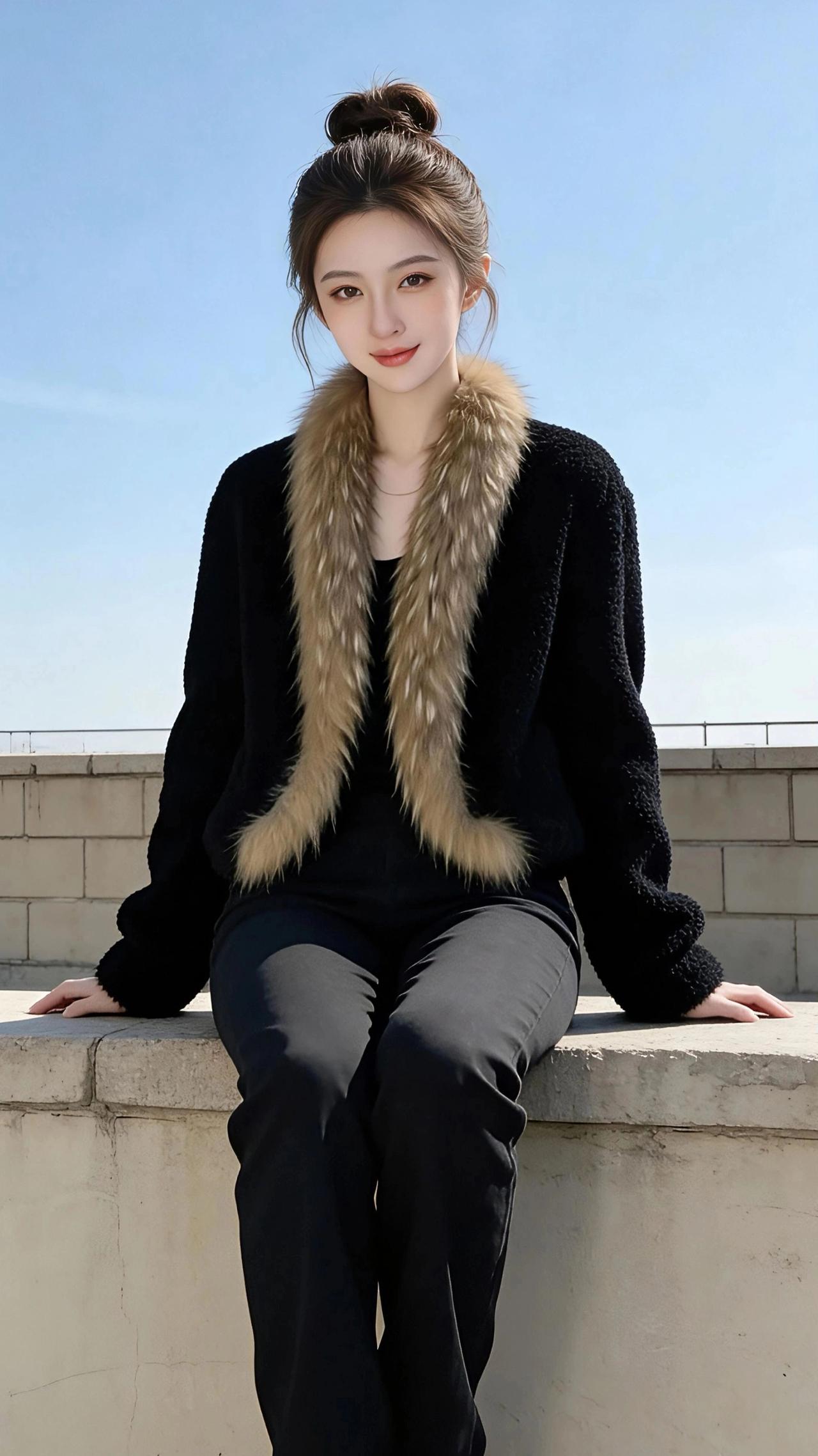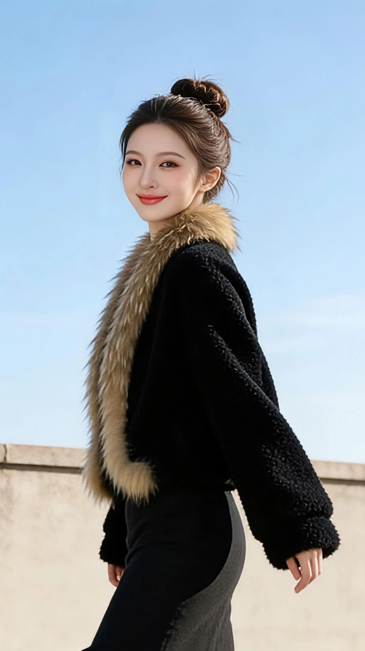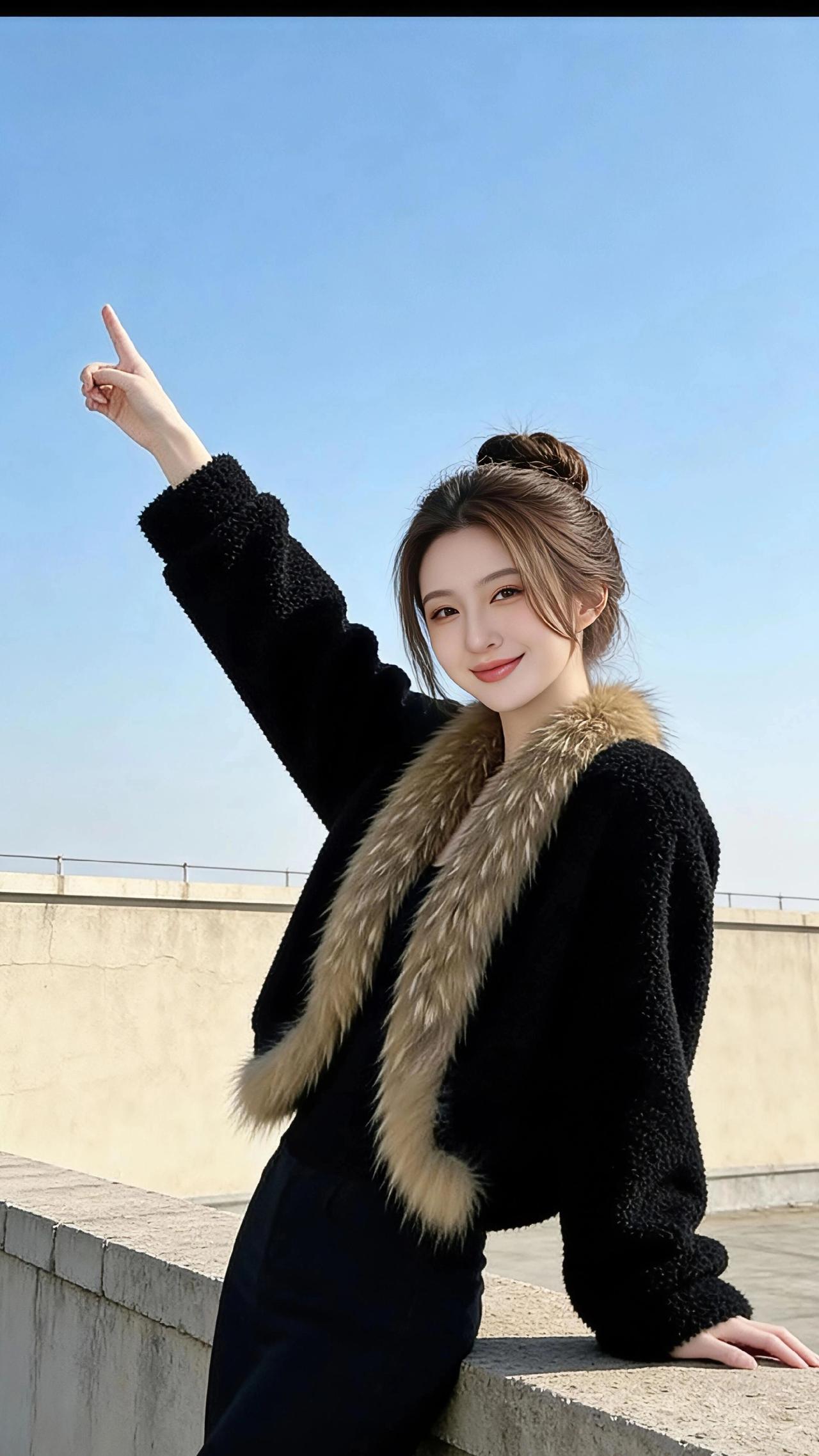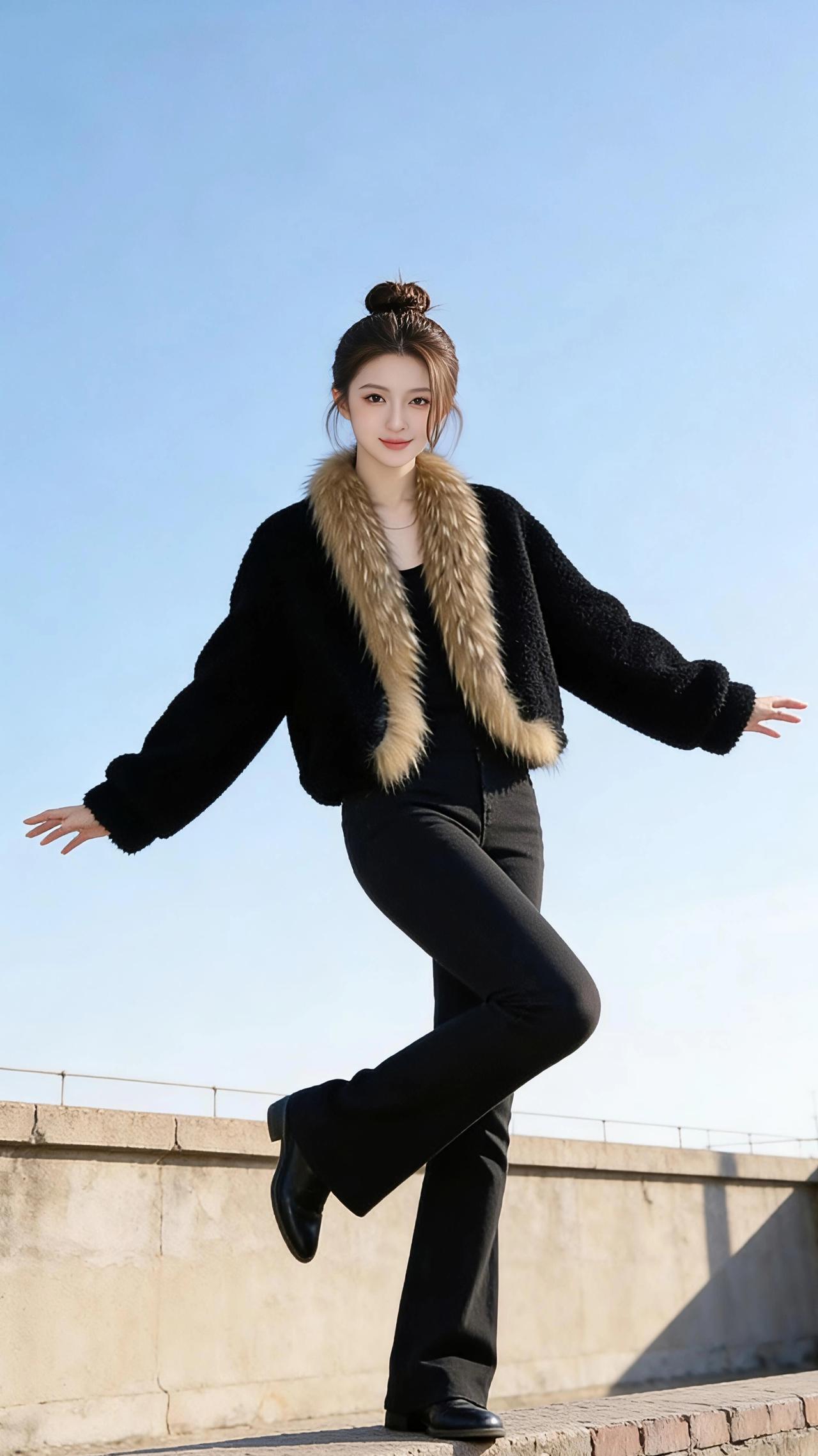 晴空下的绒光 矮墙是城市里最温柔的取景框——天蓝得像被揉碎的水晶,风裹着日光,把她发顶的碎发吹成轻颤的绒絮。 她站在砖色的矮沿上,黑色绒衫裹着暖,狐狸毛领是颈间最软的云,泛着浅金的光。指尖向上时,像要碰一碰流云;侧身倚墙的刹那,影子又和晴空融成一幅淡墨画。 风过时,衣摆晃成温柔的弧度,她笑起来,连阳光都慢了半拍——原来冬天的暖意,从不是雪堆里的炉火,是晴空下站着的人,把绒光和笑意,都酿成了季节里的甜。 高级感穿搭 休闲穿搭 冬季穿搭 保暖穿搭