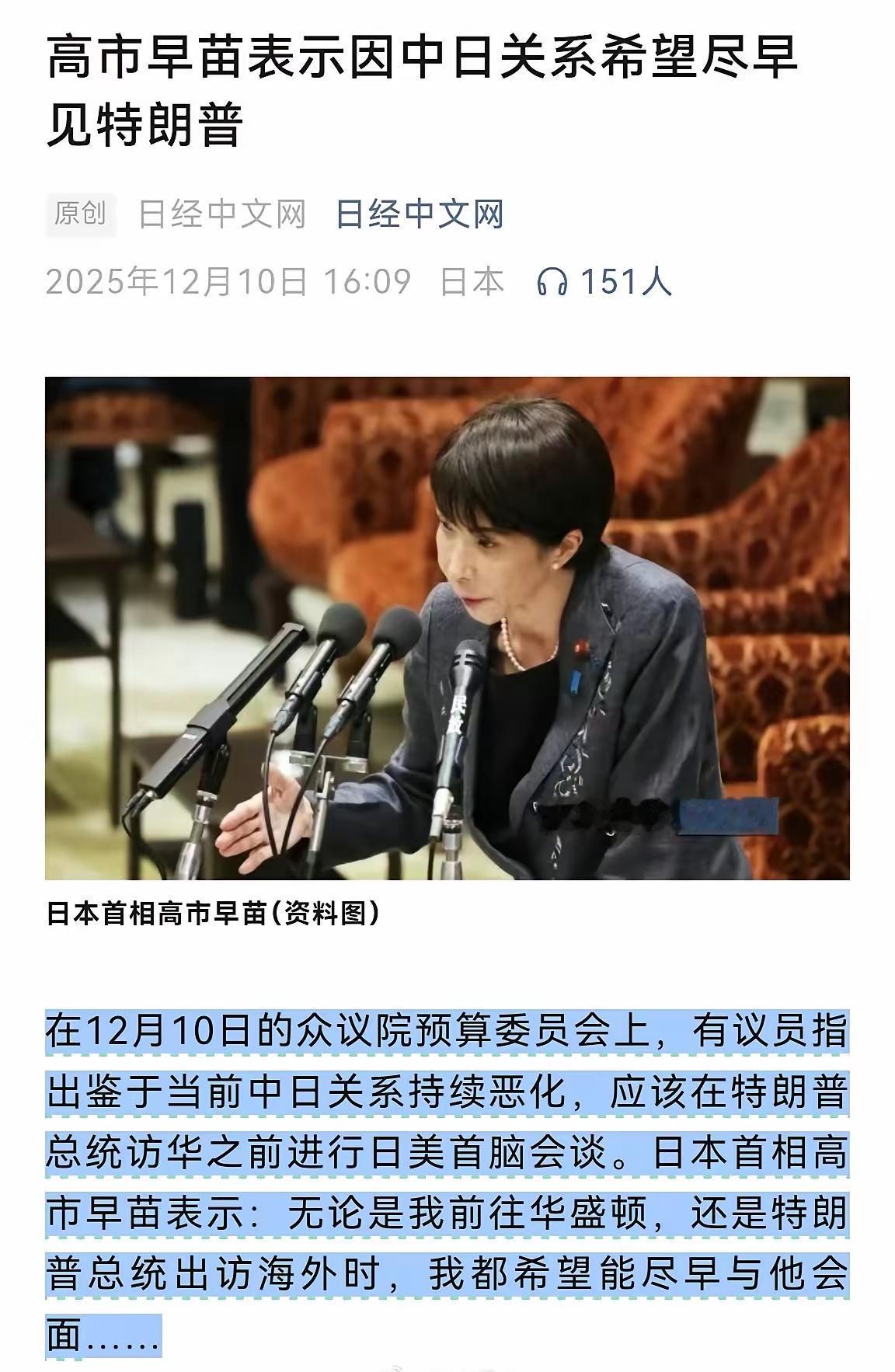 高女士要见爸爸。 近日,日本媒体传出消息,高市早苗因为中国各方面的压力,已经害怕了,她现在迫不及待要见到一个能给她温暖的人,放眼全世界,这个人就是特朗普。 美国是日本的靠山,像是一位慈祥的父亲。现在女儿有困难,急着要见爸爸。 还记得前一阵子特朗普访日。高市早苗依偎在特朗普的身边,高兴的手舞足蹈,又蹦又跳,爸爸轻轻搂着女儿的肩膀,那是高市早苗一生最幸福的时光。 如今,高市早苗闯了祸,眼看着爸爸和龙国要见面,高市早苗慌了,她担心自己被卖,于是她急着要赶在中美会晤之前要见到爸爸。
