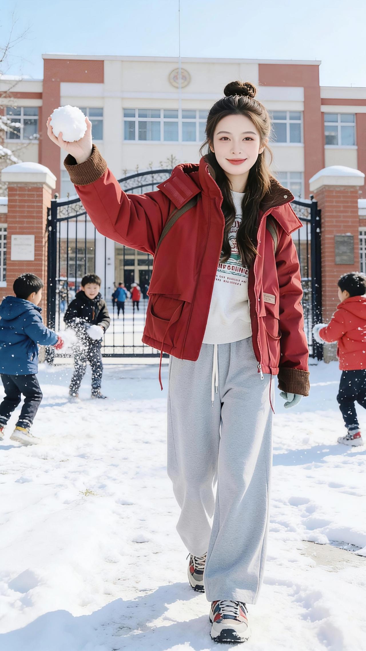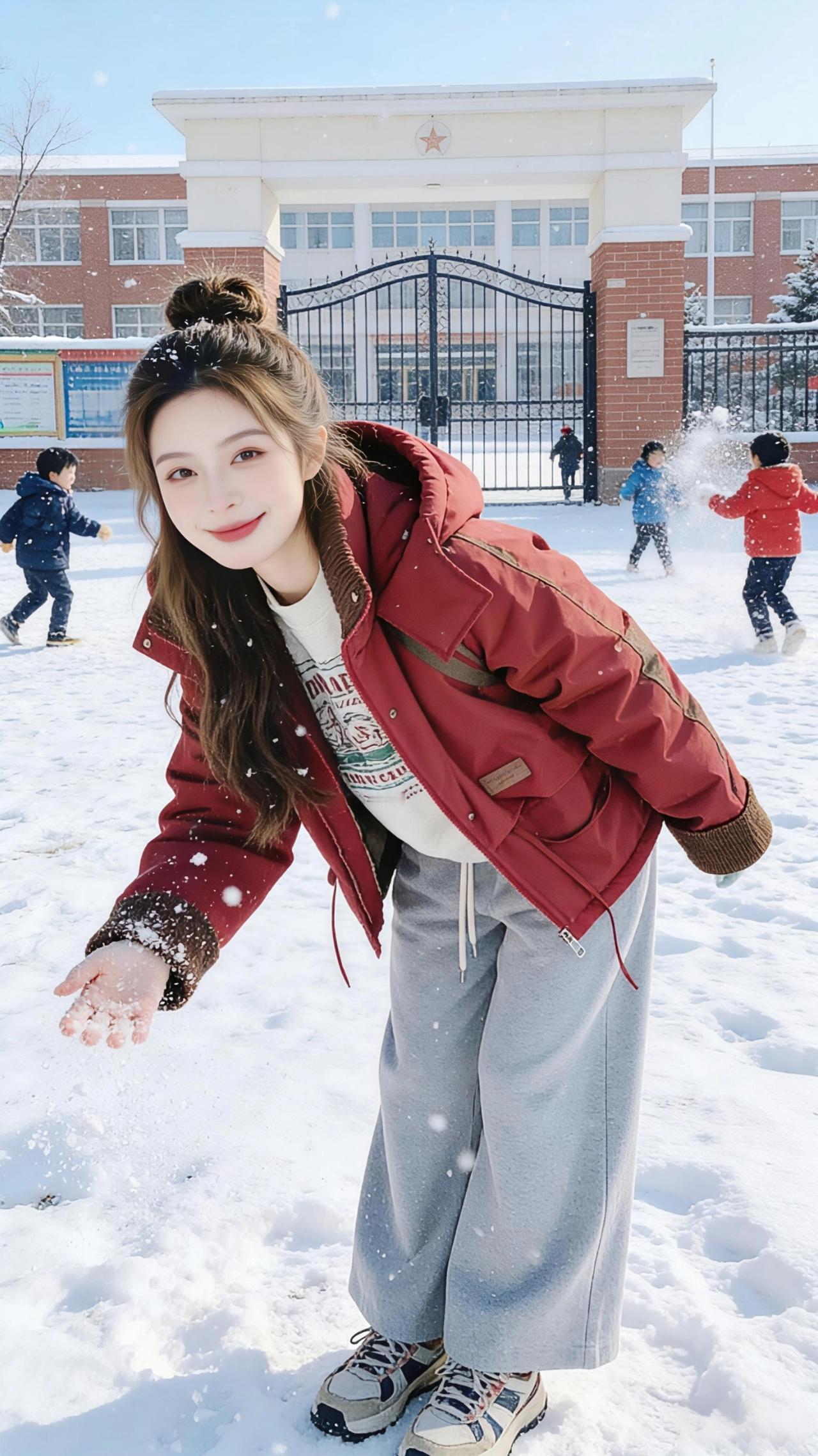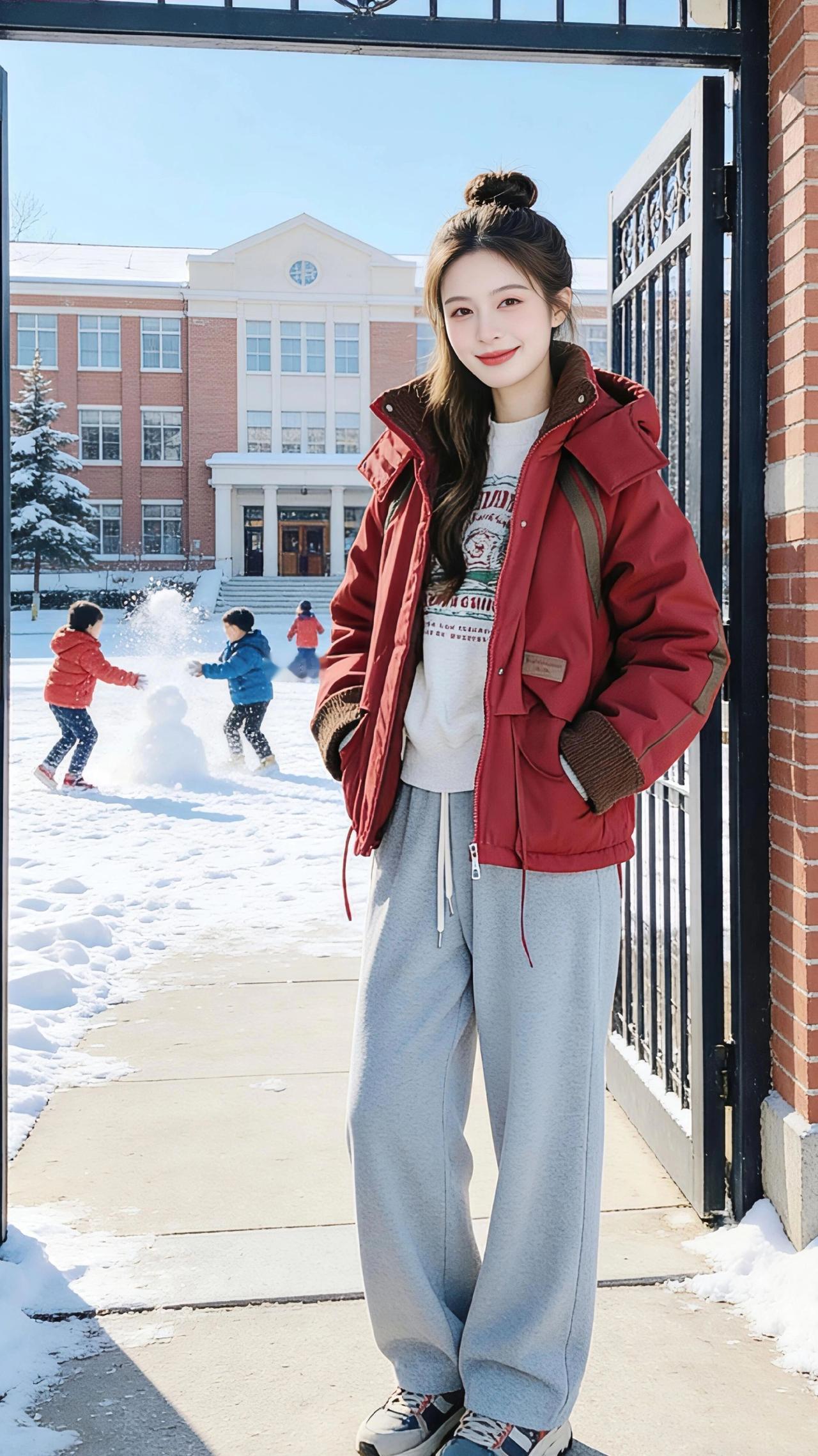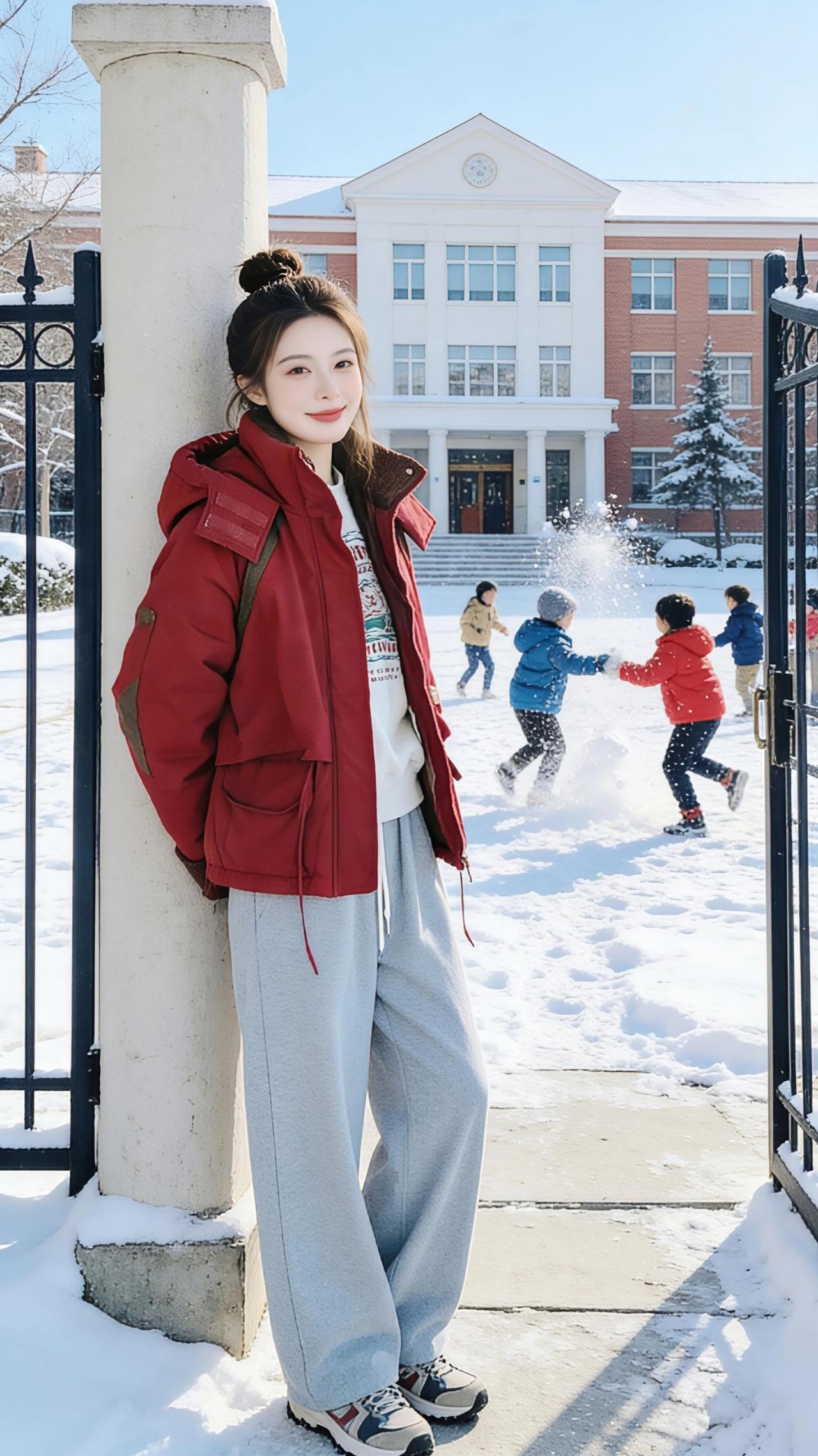 雪是冬天写给人间的信,落在红砖校舍的檐角,也落在她酒红色棉服的肩线。 她站在铁门旁,看风把碎雪揉成孩子掌心的雪球——那团白里裹着笑闹,裹着少年人没轻重的雀跃,也裹着她发梢坠着的星子。灰绒裤脚扫过积雪的纹路,像扫过旧时光里某个课间的余温,连空气里都浮着软乎乎的暖。 她抬手时,雪就从指缝里漏成光斑,身后的教学楼是默片里的布景,而她是这帧冬日光景里,最鲜活的注脚。冬季穿搭 新年穿搭 保暖穿搭