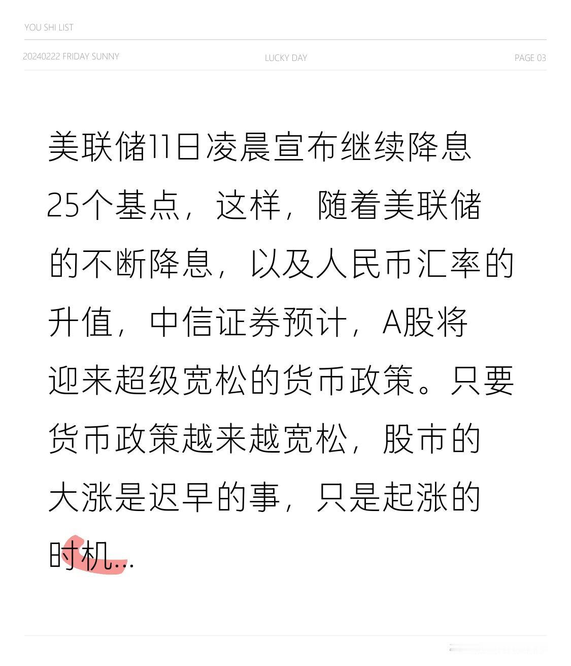 美联储11日凌晨宣布继续降息25个基点,这样,随着美联储的不断降息,以及人民币汇率的升值,中信证券预计,A股将迎来超级宽松的货币政策。 只要货币政策越来越宽松,股市的大涨是迟早的事,只是起涨的时机和节点在哪里而已。 总之,真正的投资者不必悲观,而应继续守株待兔,静待风口的到来。 券商 证券板块 美囯降息