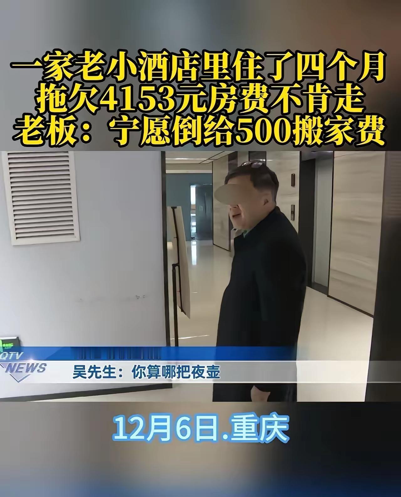 活久见!重庆一家老小赖酒店4个月,欠4千多房费,老板倒贴钱都撵不走! 我刷到这事被惊到了!天底下还真有这种事,真无法无天了…重庆鞠老板的酒店里,住着吴先生一家老小,从7月住到现在,欠了4153块房费不说,老板好话说尽,承诺免掉所有房费再倒贴500块搬家费,人家愣是不挪窝,还骂老板“算哪把夜壶”。 这家人一开始还正常交房费,后来就开始耍赖,哪怕酒店断水断电,屋里也天天留人守着。 鞠老板看着80岁的老人和10岁的孩子,实在狠不下心硬赶,夜里愁得失眠,生怕老人摸黑上厕所出意外。自己被人欠十几万是难处,但也不能拿别人的善良当挡箭牌啊! 做生意谁不是挣点辛苦钱?遇到这种毫无底线的老赖,真心替鞠老板憋屈!这事儿到底该咋解决才解气?唉!真是无语… 重庆酒店老赖事件 善良不是被欺负的理由