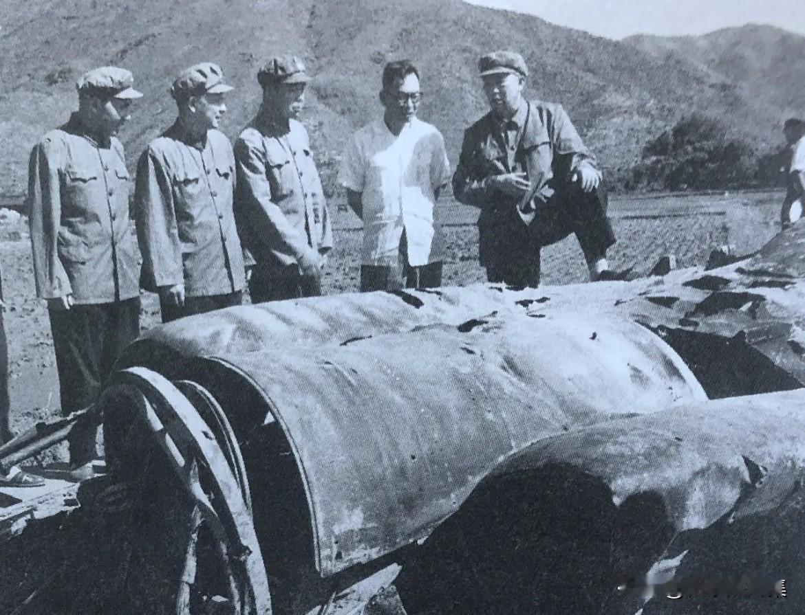 1964年7月7日,中国空军地空导弹二营在福建漳州成功击落一架美制U-2高空侦察机,这是二营继1962年9月9日、1963年11月1日之后第三次击落U-2飞机,创造了世界防空史上的奇迹。图为空军司令员刘亚楼(右一)、福州军区司令员叶飞(右二)等观察美制U-2高空侦察机残骸的场景。
