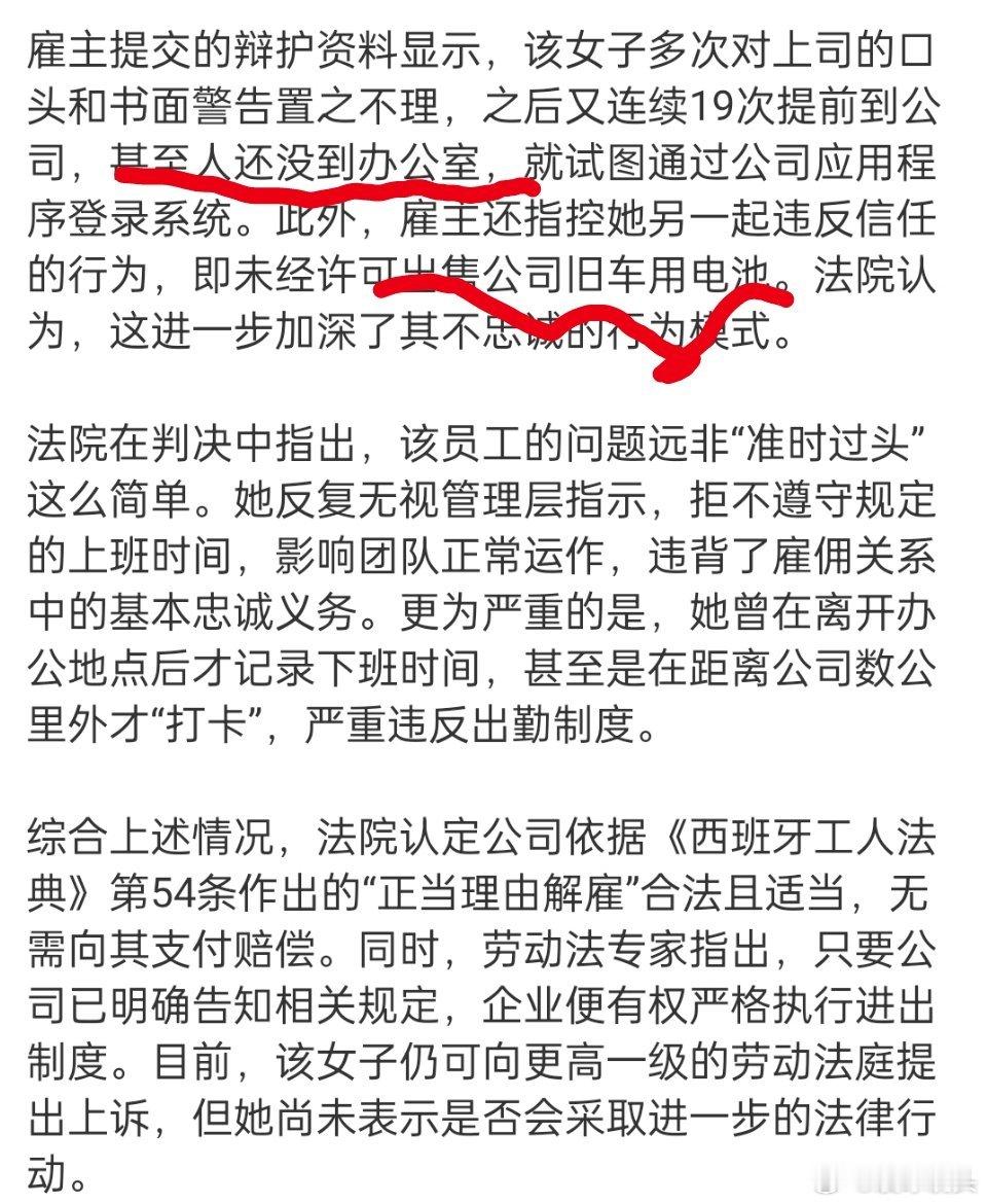 女子连续早到岗被开除这个西班牙女子被开除一点都不冤,我要是公司老板,可能还要让她赔偿公司财物损失。这新闻标题纯属是避重就轻。要是这个西班牙女子老老实实提前上班是不会被开除的。他被开除的主要原因有两个,一个是虚假打卡,人还没到公司就打上班卡了,人都出公司了才打下班卡。另一个是变卖公司的旧车用电池,损害公司利益。