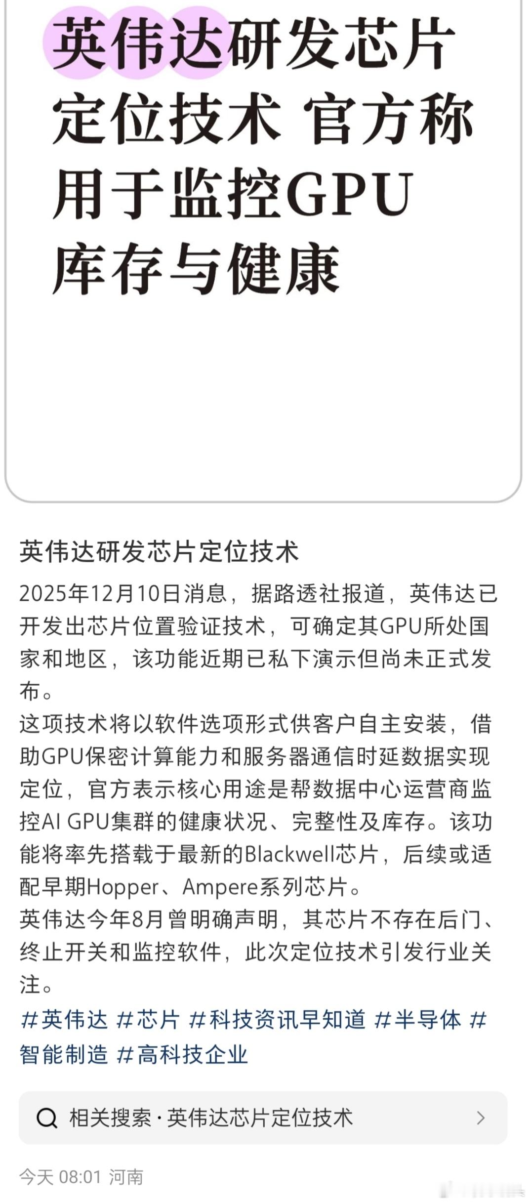 曝英伟达已开发芯片定位技术英伟达之前给我们卖阉割版的芯片也就罢了,现在直接开始芯片定位了。这东西不应该偷偷搞吗?这么明目张胆的爆出来。你说没后门就没后门啊?这不此地无银三百两吗?我们还是要加快发展我们自己的电子产业,尽量摆脱对国外电子元件的依赖。这些国外产品关键时候真的是可能威胁到国家安全的。这可不是危言耸听,人家传呼机里面都能搞事,一道禁令就能让你手机变砖头。