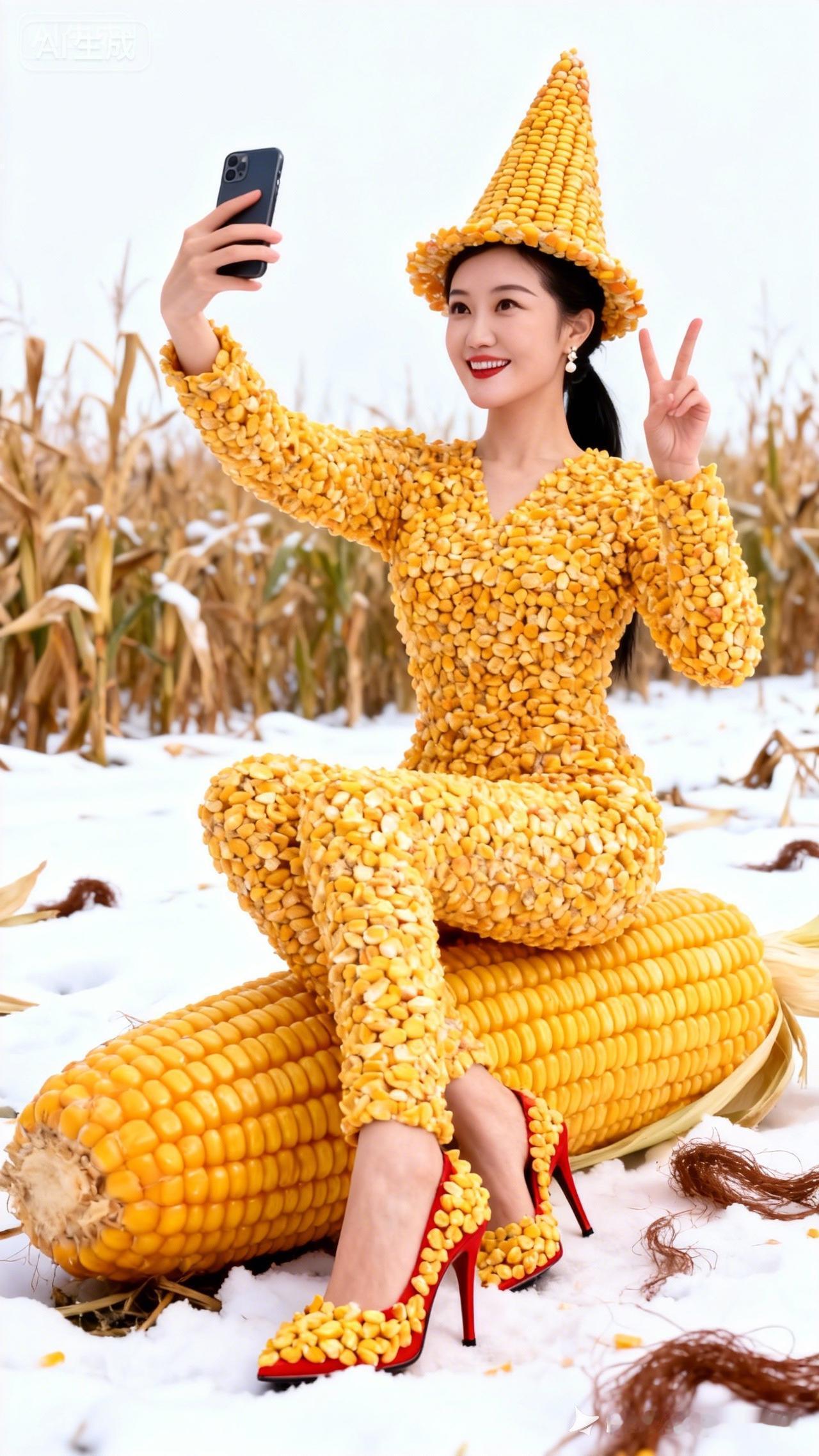 这位小姐姐穿着玉米套装,在雪地里自拍。
