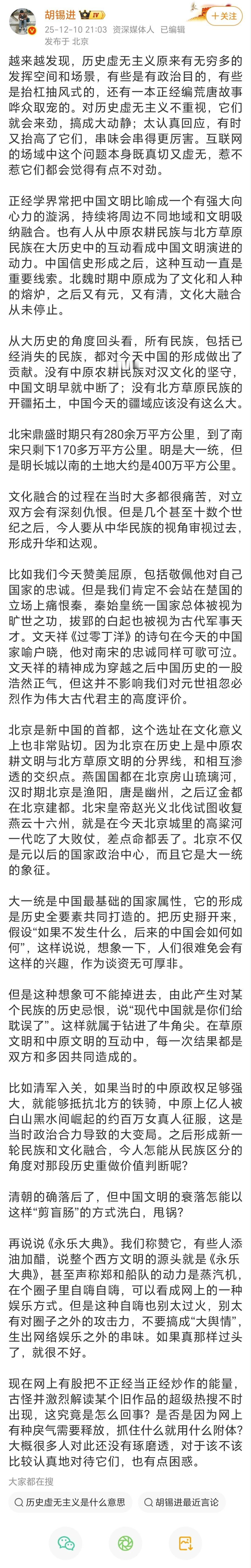 胡锡进:清朝的确落后了,但中国文明的衰落怎能以这样“剪盲肠”的方式洗白,甩锅?