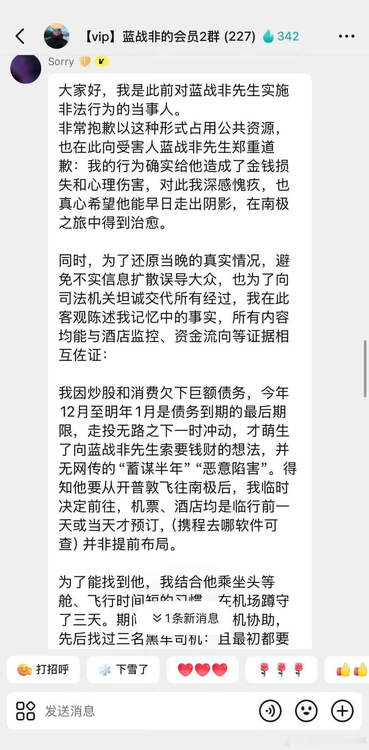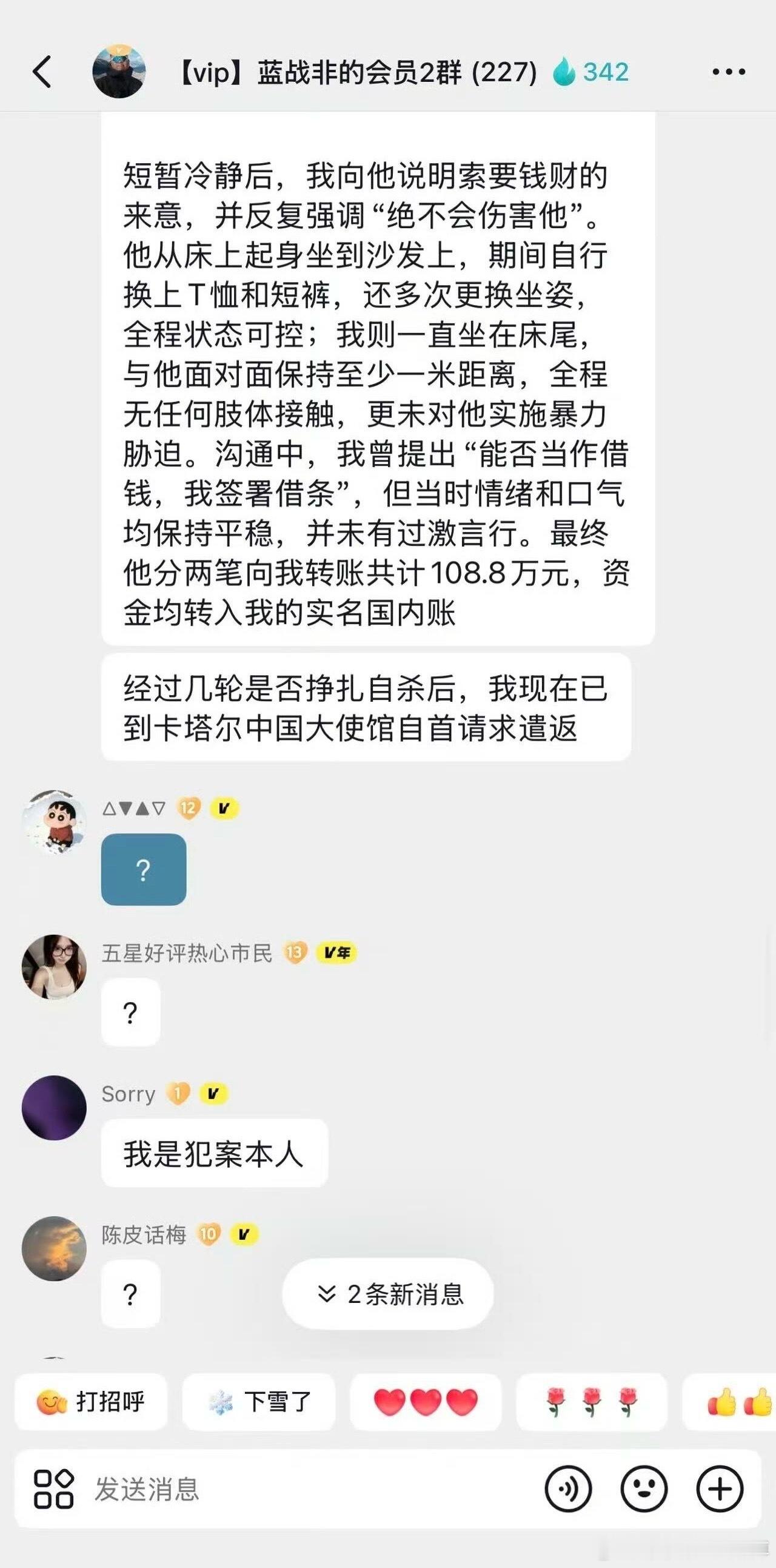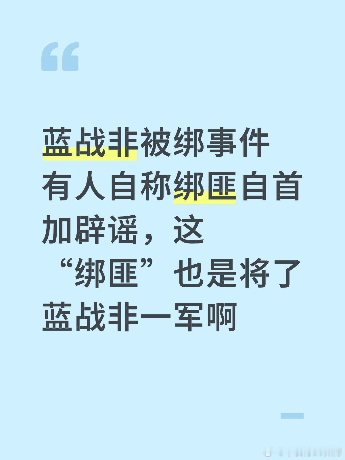 被疯传的这些图片再次震惊到,这“绑匪”号称要自首,但辟谣的信息有点多,也是将了蓝战非一军啊。事情一下向很奇怪的方向发展了,号称99%不能破的绑架案,这次要属于那1%了么?辟谣的信息包括,没有预谋半年,没有买航班信息,没有拿刀只拿了防狼喷雾枪,没有买通酒店员工,没有带黑人进房间,没有言语威胁,没有肢体接触,还说给蓝战非磕头了,这描述的有点离谱他妈给离谱开门了属于是。 关于取J行为也说没有强迫,话说这种事说不强迫本身也有点侮辱人了,难不成你吱一声还说好商量的就能让人配合呢?这是闹哪出,好像话里话外把能摘出去的都摘出去了,一个来护舆情的绑匪么,就是跟蓝战非的话冲突不少,所以这是来将军吧,这手也挺高啊!热点观点华俊竹有话说