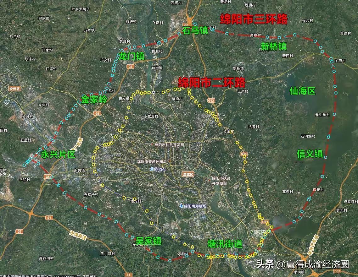 绵阳的环城路可以再放大点,除了现有的环线网络外,还可以增加两条环线路,第一条就是