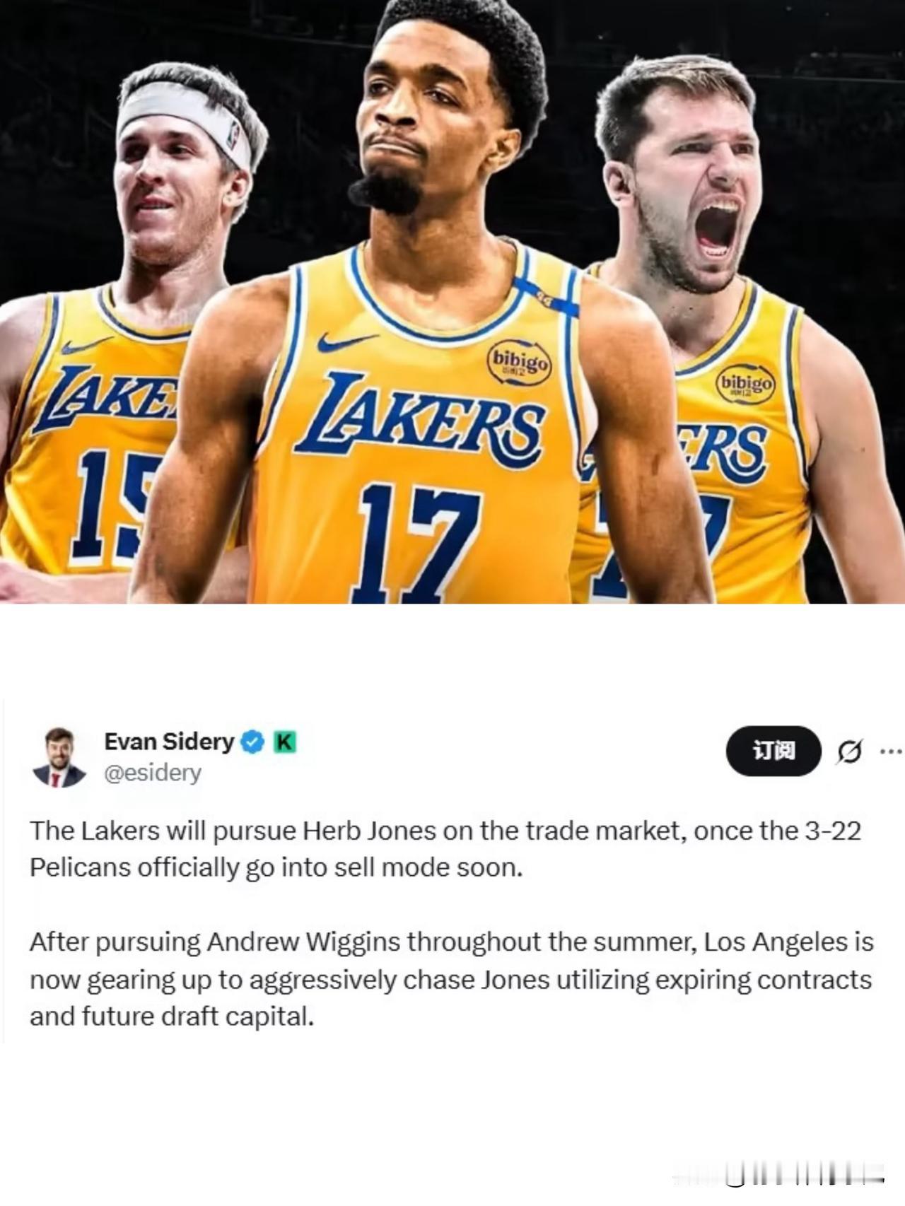 湖人争冠的最后一块拼图? 据NBA名记Sidery报道,由于战绩糟糕,鹈鹕将开启甩卖模式。湖人趁机将全力追求鹈鹕队的赫伯特-琼斯。湖人主帅雷迪克认为琼斯将是球队争冠需要的最后一块拼图。 琼斯拥有顶级的防守直觉,出色的身高臂展和全面的防守能力,他能提升湖人点对点和整体的防守档次。 本赛季琼斯代表鹈鹕队出战17场,场均可以贡献9.9分3.9篮板2.4助攻1.6抢断1.1封盖。
