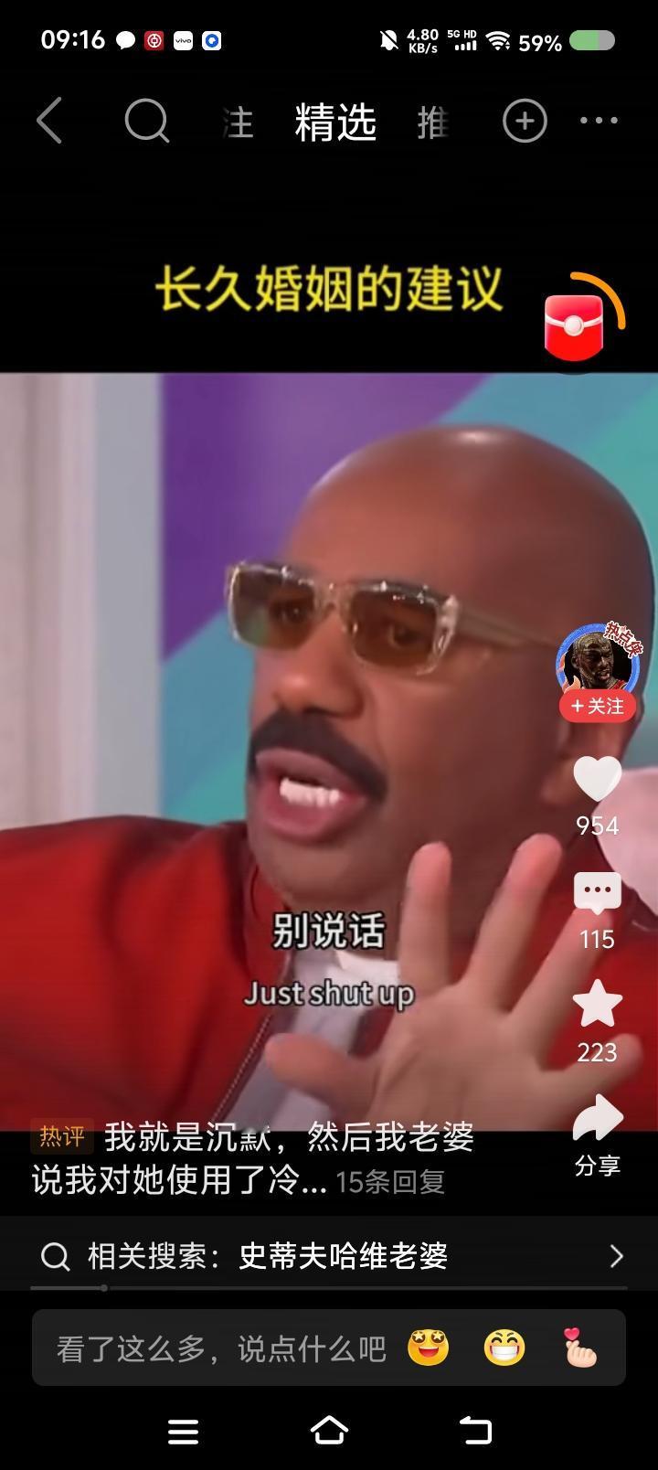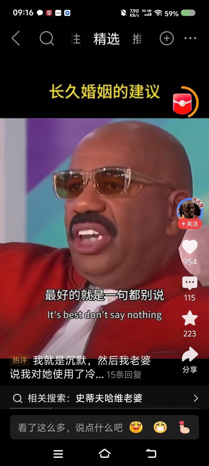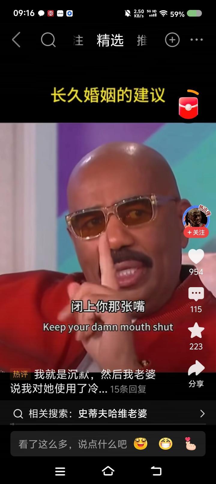 哈维对已婚男人的建议—— 节目中,哈维说:“婚姻要长久,男人要学会闭嘴。别解释。你解释不了。” “如果你是对的呢?”另一嘉宾问。 “什么?”哈维反问。 观众乐了。 点评: 有人说,家里讲爱,不要讲理。一讲理,矛盾层出不穷。 有道理。 但比这更重要的是,得有人讲点什么,不能不说话吧,防止“聋哑婚姻”。