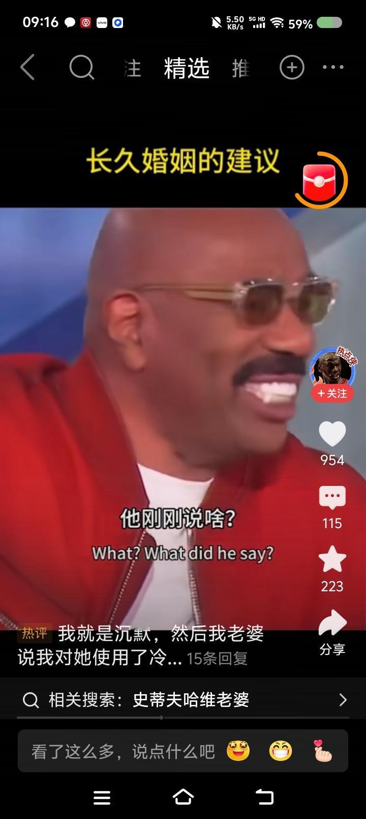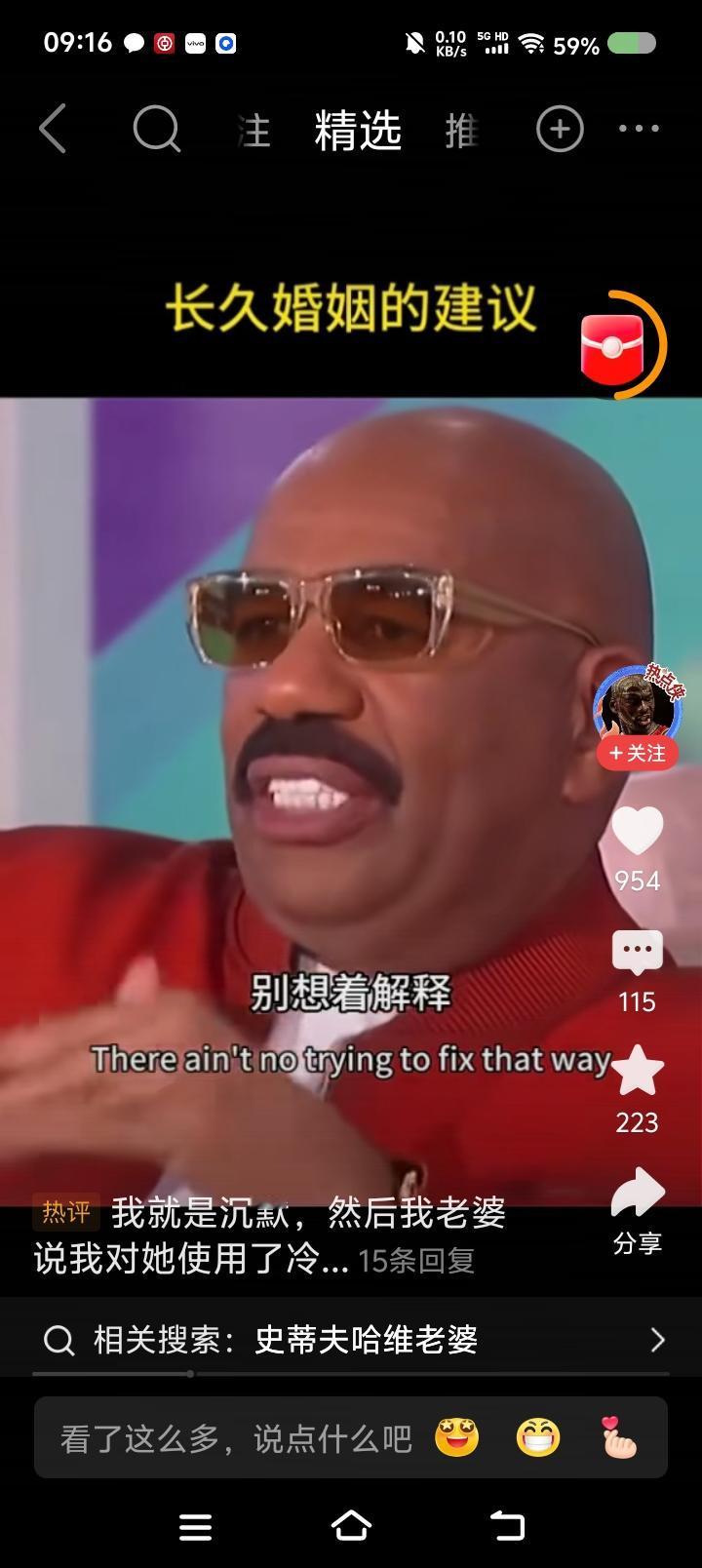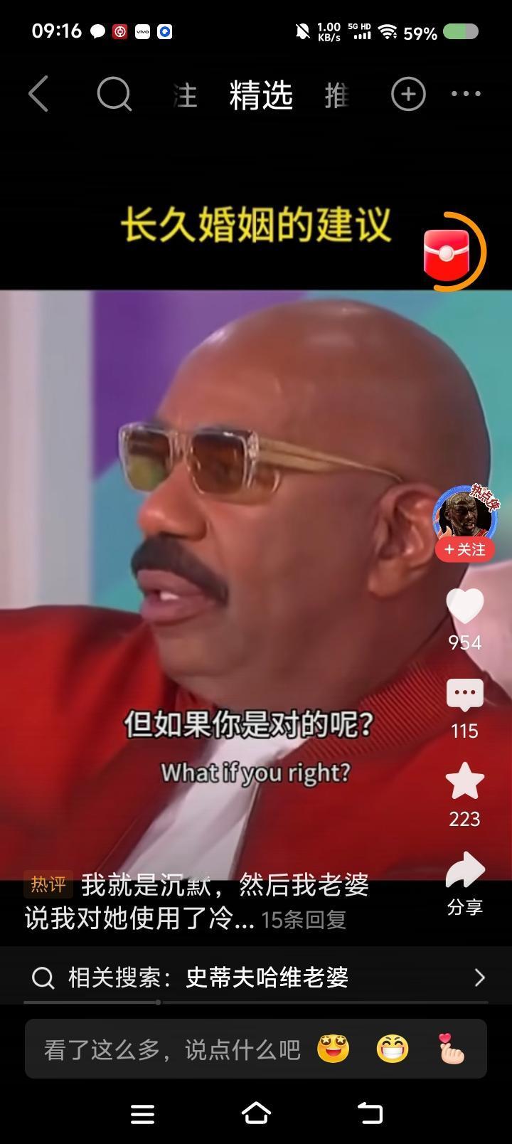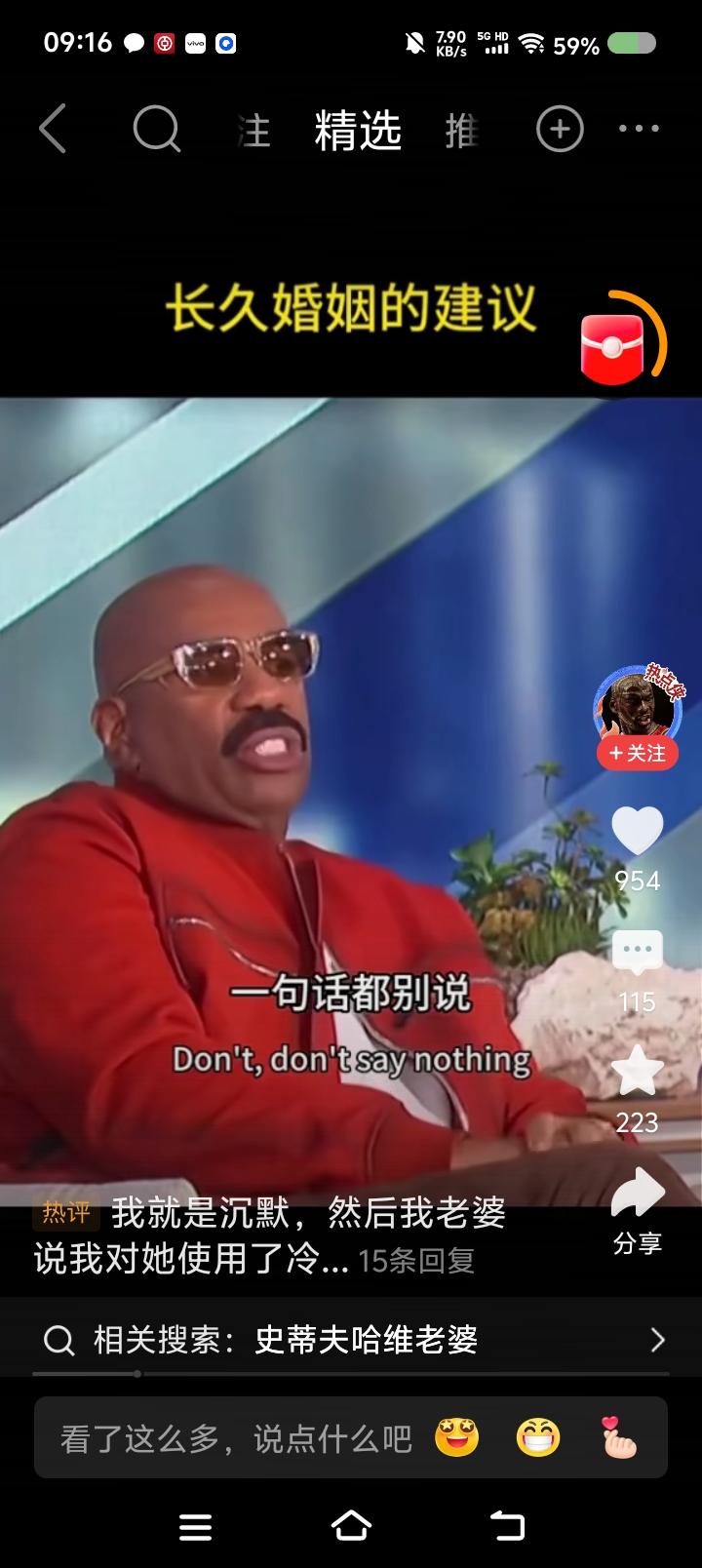哈维对已婚男人的建议—— 节目中,哈维说:“婚姻要长久,男人要学会闭嘴。别解释。你解释不了。” “如果你是对的呢?”另一嘉宾问。 “什么?”哈维反问。 观众乐了。 点评: 有人说,家里讲爱,不要讲理。一讲理,矛盾层出不穷。 有道理。 但比这更重要的是,得有人讲点什么,不能不说话吧,防止“聋哑婚姻”。
