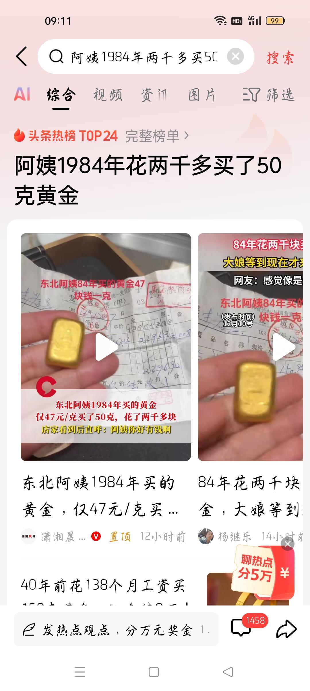 阿姨1984年花两千多买了50克黄金,我想说 据潇湘晨报-晨视频报道,近日,一位金店店员曝光一位东北阿姨1984年花两千多买了50克黄金,店员说,阿姨你好有钱啊!当时47元/克,我想说,阿姨确实有钱,能拿出2000多块买黄金,因为当时大多数工薪阶层就是40~50元/月,有人说,阿姨存到现在划不来,个人认为,如果存银行更划不来,也有人搞投资,投资有风险。看阿姨笑嘻嘻的,心情很好,个人认为,阿姨应属于不差钱的人,一件东西能够保存41年也不容易啊!各位条友觉得呢?