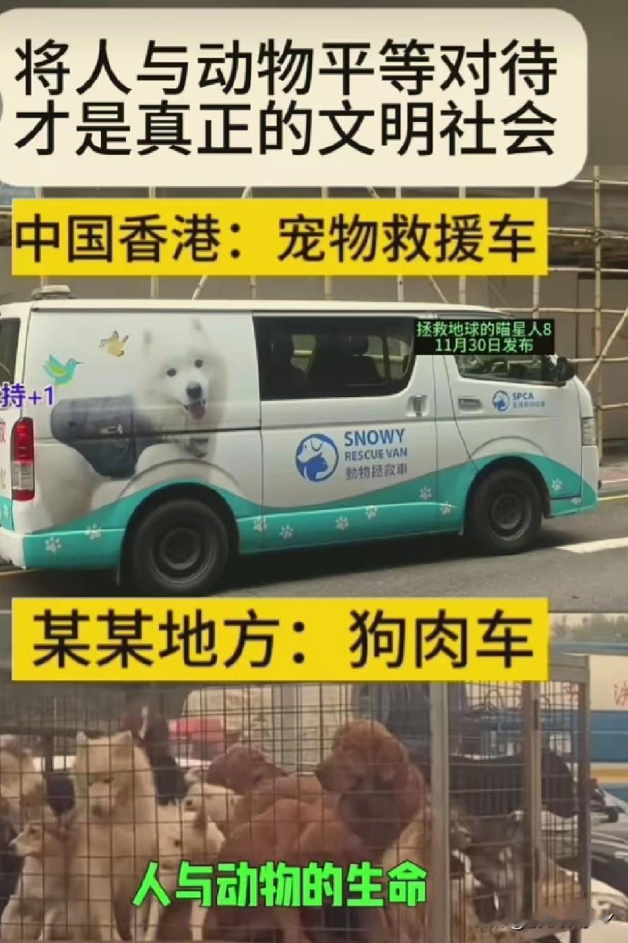 看到香港的宠物救援车为毛孩子们点亮起希望之光,又听闻有生命在铁笼中痛苦挣扎,我不禁感慨万千。 那些在人生旅途中相伴的猫狗,它们的忠诚与可爱,本就该得到温柔守护。 我们不要纠结所有动物的界限,不妨先从身边的伴侣动物、流浪动物入手,予以尊重与善待。 每一次对它们的精心照料,都是文明的闪耀。 香港动物救助
