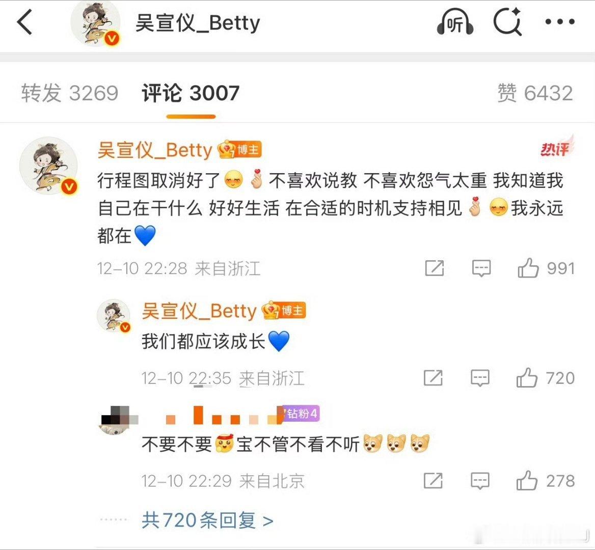 有粉丝在吴宣仪评论区对她近期工作指手画脚,吴宣仪说自己知道在干什么,觉得粉丝也应该成长,别太说教也太有怨气,打算取消之后的行程图分享。