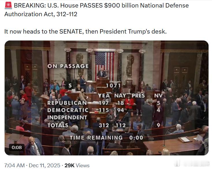 美国众议院以312票赞成、112票反对通过了9000亿美元的《国家防务授权法案》。该法案现在将送交参议院,然后提交特朗普总统签署。