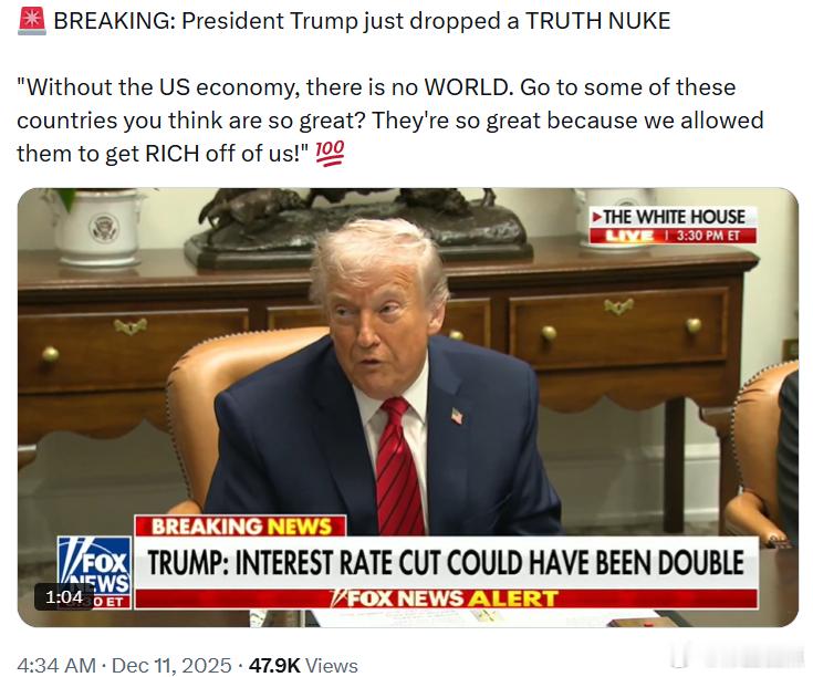 特朗普总统刚刚抛下了一颗“真相炸弹”:“没有美国经济,就没有世界。去那些你认为很棒的国家看看?它们之所以那么棒,是因为我们允许它们靠我们发财!”