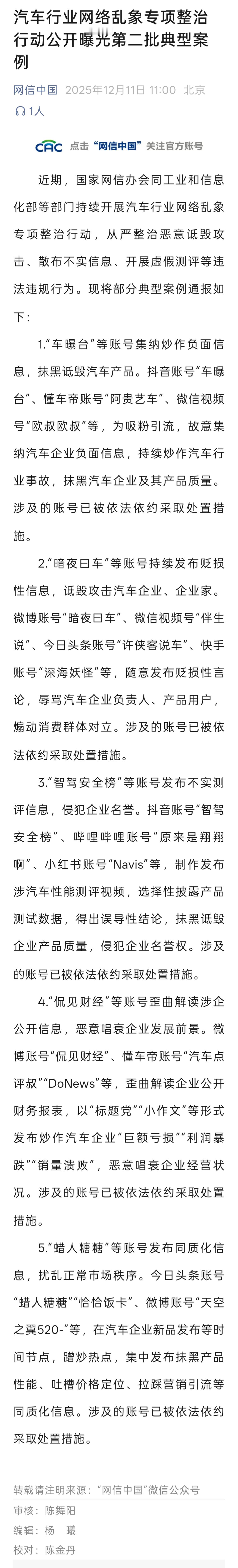网信中国公布第二批「汽车行业网络专项典型案例」暗夜同学上榜了,车曝台感觉是常客了。另外,那个小红书账号“Navis”是大学生慢点么? 汽车行业网络乱象专项整治