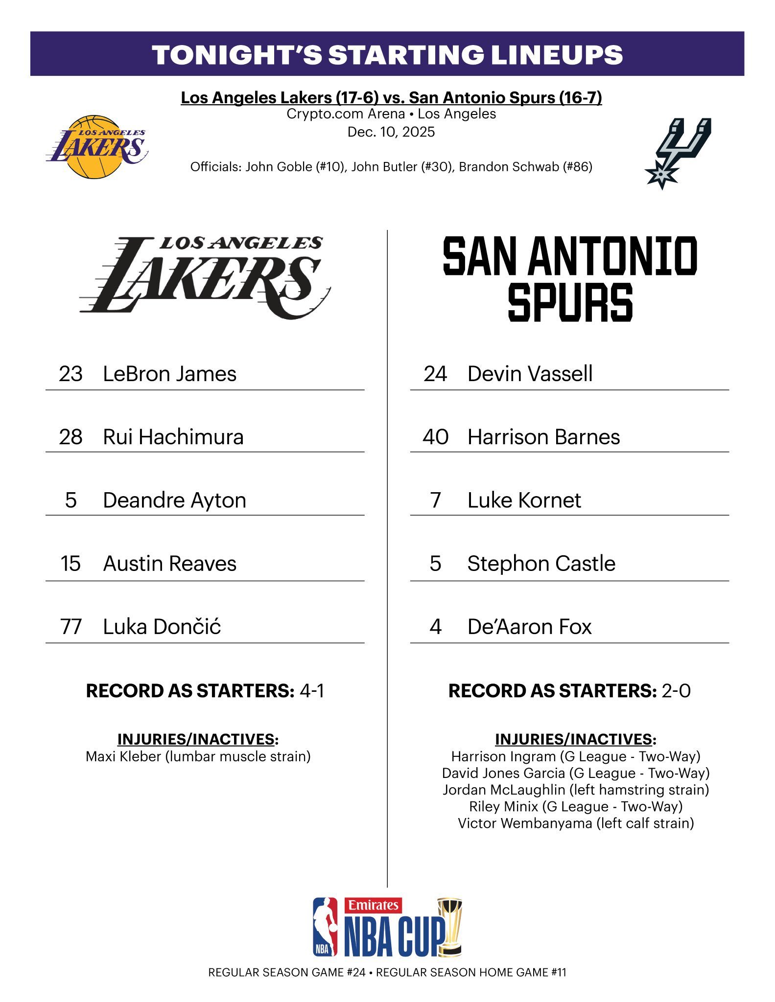 湖人今日首发:东契奇、里夫斯、八村塁、詹姆斯和艾顿.湖人国度洛杉矶湖人