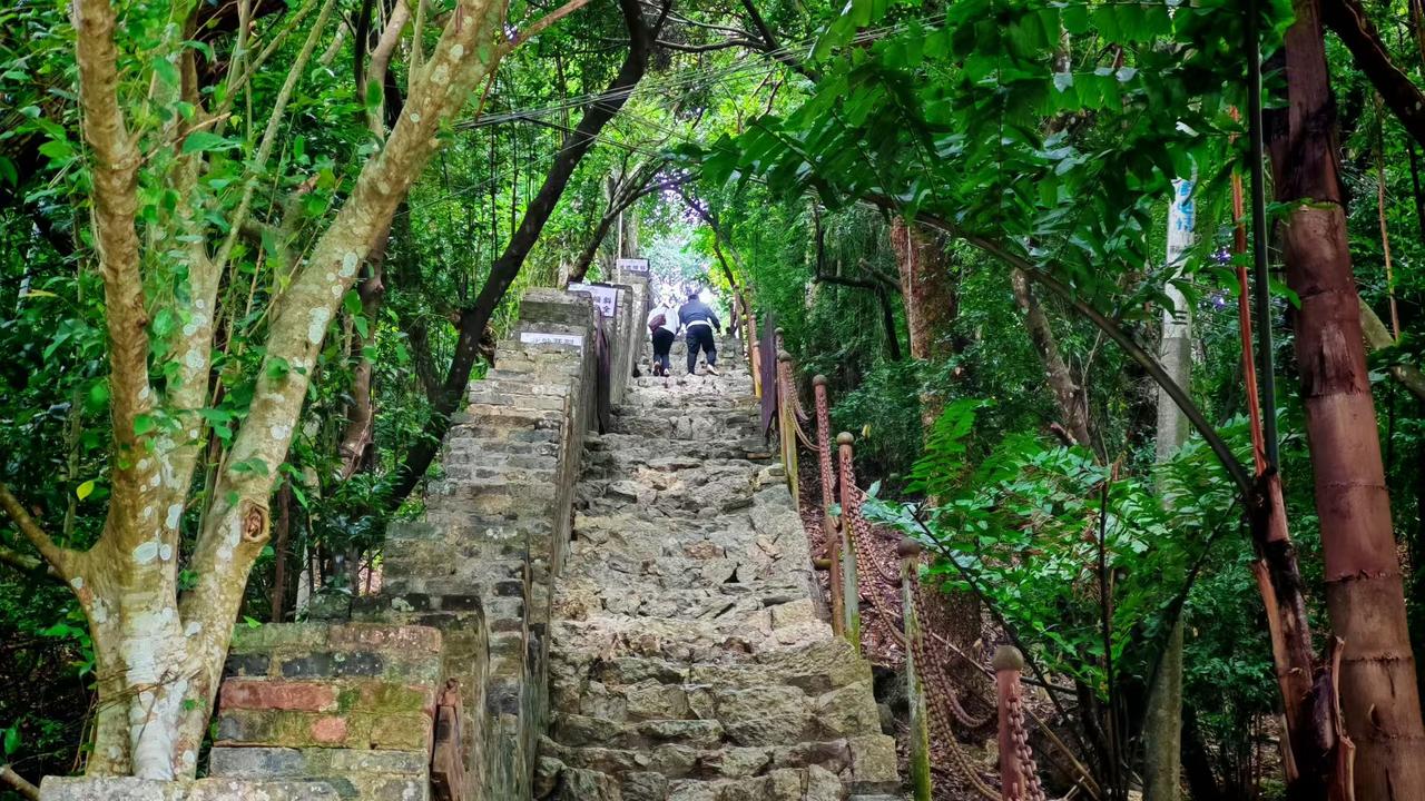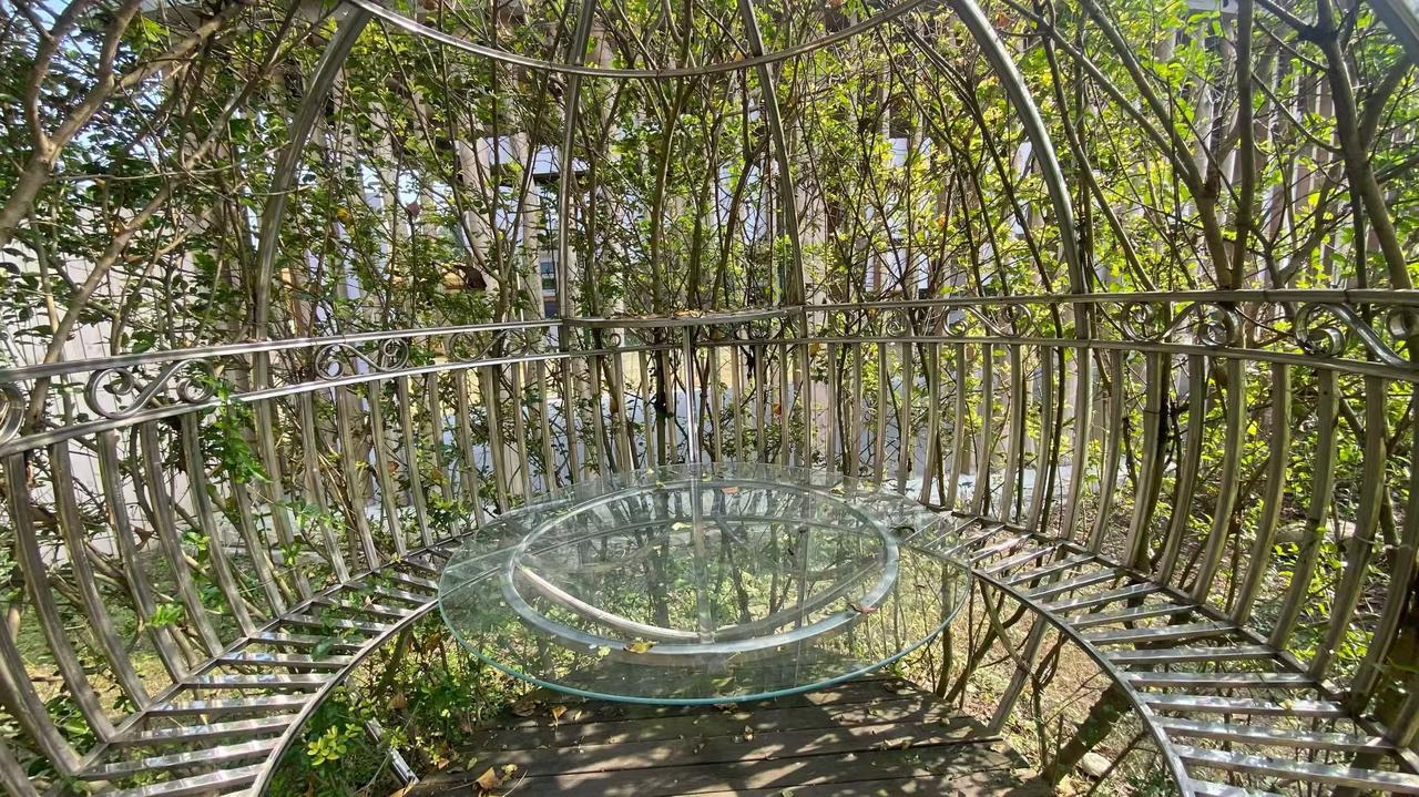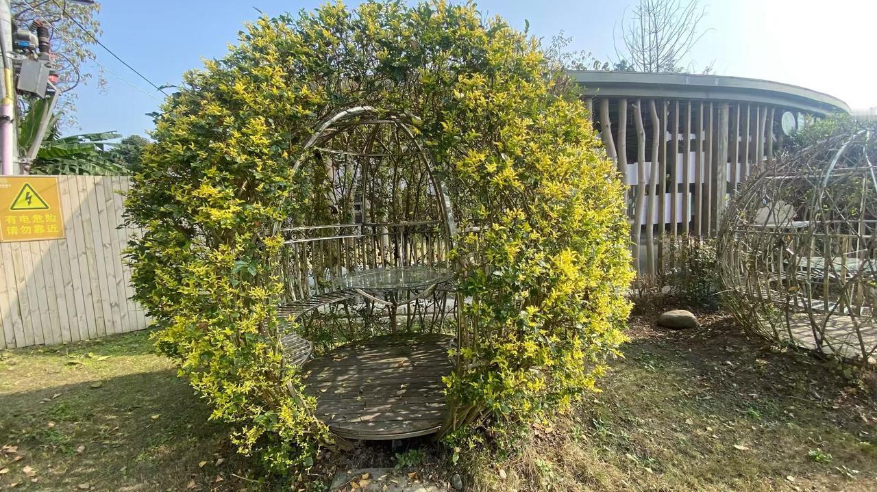 阳光把叶尖晒得发亮,藤蔓裹着金属架织成半透明的绿穹。木台嵌在丛里,像偷藏进春天的小角落——连风路过,都慢了半拍。