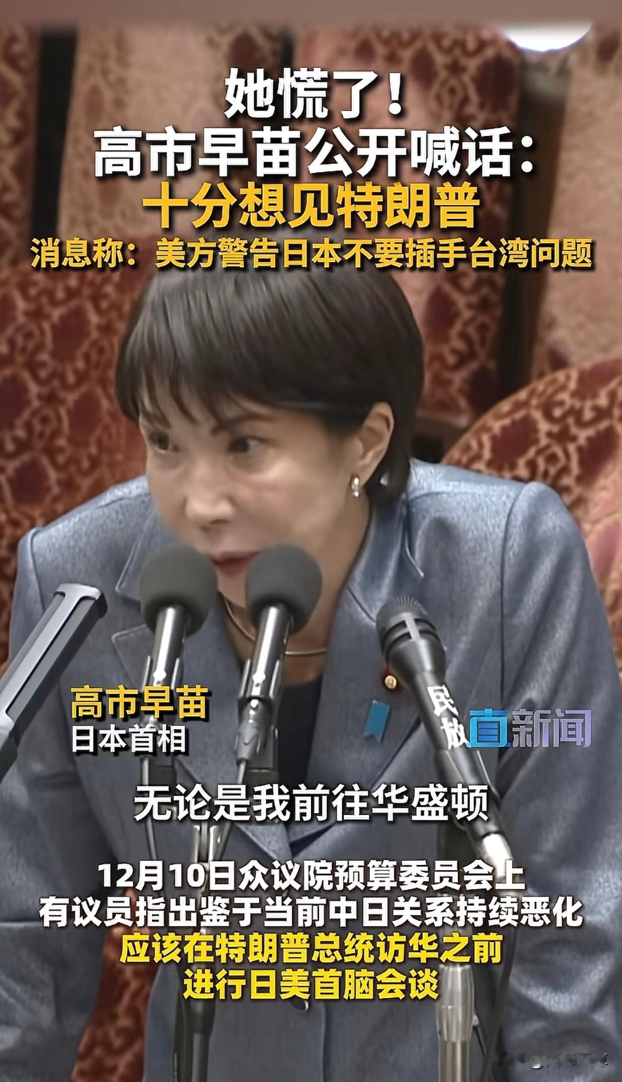 她可能真的害怕了,甚至公开喊话想见特朗普。近日高市早苗表态说,希望能在特朗普总统访华之前,进行一次日美首脑会谈。很明显,高市现在知道怕了,以为她似乎没意识到,就那么一句话,居然惹出了这么大的麻烦。最关键的是,美国居然没支持。在这样的情况下,高市希望能面见特朗普寻求支持。个人认为,她的愿望是美好的,但特朗普未必就愿意见她。其实她现在最好的办法,就是赶紧道歉,体面辞职。否则未来落得一个跟安倍一样的下场,也是有可能的!