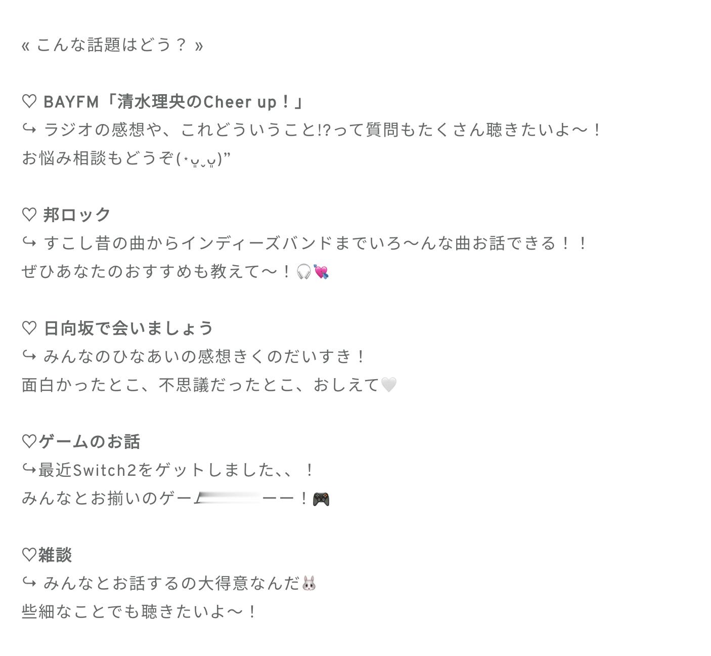 清水理央「まだまだこっからだぞ!!!ここがスタートラインだぞ!!!という気持ちで。自分の限界を超えて、ダンス、歌、バラエティ、ラジオ、ブログ、SNS、色んな努力を重ねて、ここに選んで頂いた意味を作り出す為に、ここには清水理央がいなきゃ!と思ってもらえるような人になれるように、日向坂46の一員としてもっともっとたくさんの方に日向坂46の魅力を知って頂けるひとつの要因となり、日向坂46に還元できるメンバーになれるように、精一杯がんばります!」