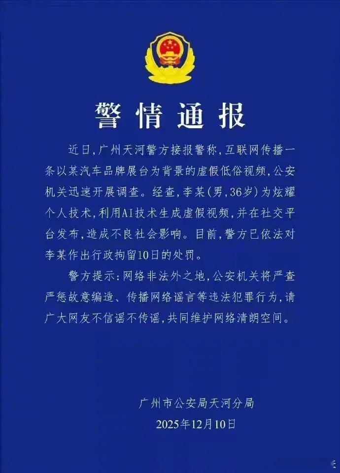网警查处一起AI生成虚假低俗视频案 这位哥还真的被抓到了!广州车展AI视频造假者被警方抓获小鹏展台AI视频造假者已被拘留