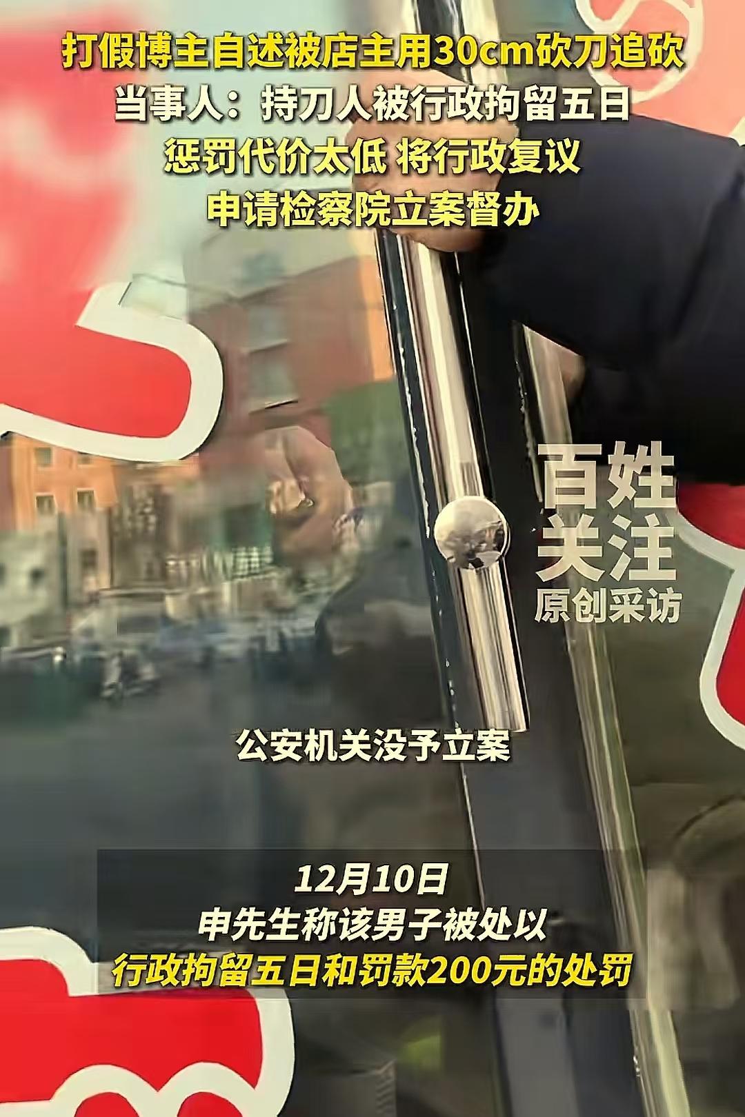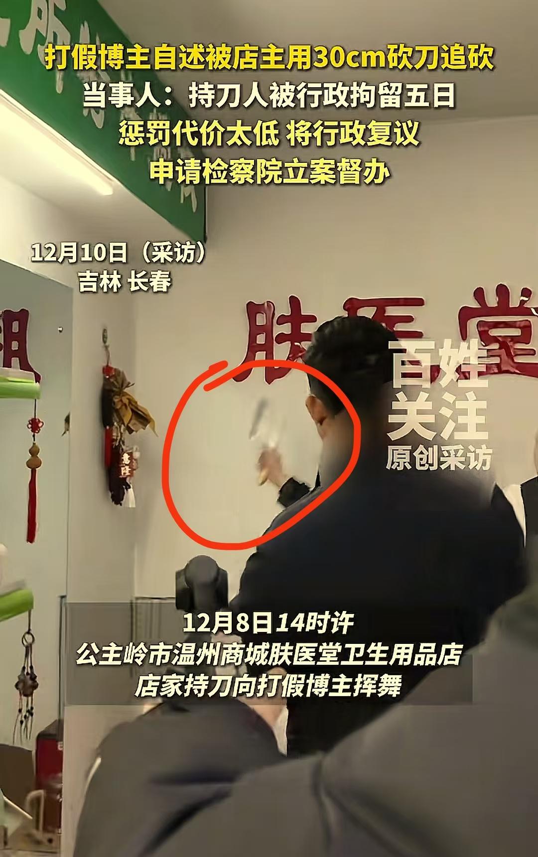 长春打假惊魂!打假博主去卫生用品店进行打假,被店主用30cm砍刀追砍!警方:行政拘留5日;博主:“拿到砍我就是要我性命,这处罚太轻了,将申请行政复议!”网友:拿刀砍人,什么时候惩罚这么轻了? (来源:红星新闻) 申先生是一位颇具正义感的打假博主,平日里致力于揭露市场上的虚假宣传和售卖假冒伪劣产品的行为,让消费者能少受一些坑害。 此前,他收到了一条关键线索,称某卫生用品店存在涉嫌虚假宣传售卖产品的问题。为了核实情况,申先生特意将该店售卖的百清膏送往专业机构进行检测。 结果令人震惊,检测报告显示,这款百清膏中竟然含有违禁成分氧化苦参碱及氯倍他索丙酸酯,这些成分对人体健康有着潜在的危害。 12月8日,申先生带着证据和团队一行人来到了这家卫生用品店,准备进行打假行动。 然而,店主看到申先生等人后,瞬间怒火中烧,他觉得申先生是来砸他的场子、断他的财路的,根本不给申先生解释的机会,二话不说就从店里拿出一把砍刀,朝着申先生猛砍过去。 回忆起当时那惊心动魄的场景,申先生至今仍心有余悸。他心有余悸地说道:“他一句话都不说,直接就奔着我的头和脖子挥砍过来,那架势就是要取我性命啊!连续挥砍了两次,还好我都挡住了。可他还不罢休,又换手继续对我挥砍,在拉扯过程中,我的衣服都被划坏了,要是当时我没挡住,后果简直不堪设想。” 事发后,申先生果断以杀人未遂向警方报了案,他满心期待着法律能严惩这个凶狠的店主,还自己一个公道。 然而,让他万万没想到的是,警方最终只对店主处以行政拘留五日、罚款两百元的处罚。 这样的处罚结果,对于申先生来说,根本无法接受!他觉得自己的生命安全在当时受到了极其严重的威胁,如果自己没有及时挡住那致命的砍刀,可能早就命丧当场了。 申先生对这样的处罚结果特别不满意,他愤怒又无奈地将这件事情发到了网上,向广大网友倾诉自己的遭遇。他气愤地说道:“我报的警是杀人未遂,可为什么只按照危害他人身体健康来进行行政处罚呢?他拿着砍刀,直奔我的脖子和头砍过来,这不是故意杀人是什么?我认为对这种如此恶劣、对社会有极大危害的人,这样的惩罚实在是太轻了。他出来之后,说不定还会继续危害社会,我绝对不会就此罢休,我一定会申请行政复议,一定要为自己讨回一个公道!” 此事引发热议,有网友说,凡是拿刀对着人的要害挥砍,都应该定义故意杀人!这个处罚太轻了,以后都拿刀来解决事情了! 也有网友说,砸人饭碗,如同杀人父母!职业打假很多都是为了钱的! 还有网友说,我支持打假的,就算他以盈利为目的又怎样?至少他做了,至少他站在消费者角度,是利好我们的,最可恨的难道不是商家吗,知假售假,以次充好,这种人最可恨! 这起事件看似是一起简单的打假纠纷,实则暴露出了法律在面对暴力犯罪时可能存在的量刑漏洞。 店主手持砍刀,目标明确地朝着打假博主的致命部位挥砍,这明显已经超出了普通的危害他人身体健康的范畴,具有明显的故意杀人意图。 而警方仅仅给予行政拘留和少量罚款的处罚,显然难以让受害者信服,也难以起到震慑犯罪的作用。 法律的目的不仅是惩罚犯罪,更是要维护社会的公平正义和公众的安全感。如果对这种明显的暴力犯罪行为不能给予应有的严厉惩处,那么法律的威严将大打折扣,公众的安全也将得不到保障。 我们期待相关部门能够重视申先生的行政复议申请,重新审视这起案件,让正义得以真正伸张,让法律的阳光照亮每一个角落。
