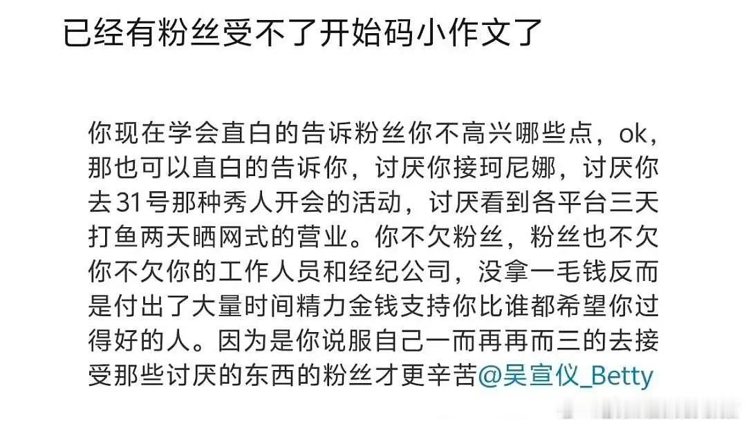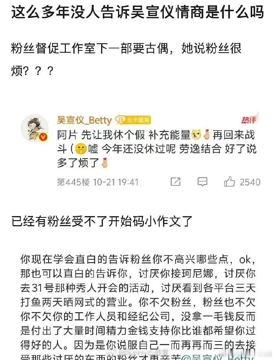 吴宣仪训粉也不是一次两次了这个姐发言一直很神,之前说什么多少杯奶茶之类的,一听就是没什么内涵底蕴的……她这个训粉让我想起了虞书欣说的这句,现在应该是不会再训粉了以后直接说95训粉1吧,另一个排不上号了~