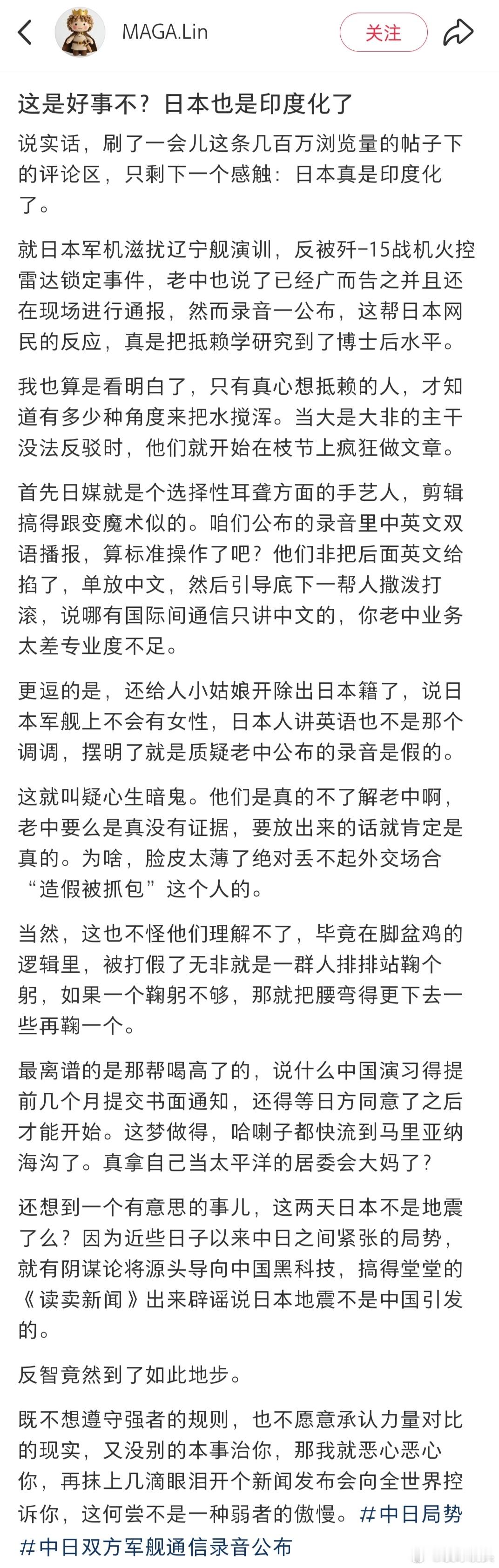 中方录音一出日本有人看不下去了日本现在硬实力不足,就只能搞一些阴谋诡计,恶心人了。结果就是惨遭打脸,又来卖惨了,拼命抵赖。要是让日本实力再增长一些,它说不定更猖狂,直接赌国运了。