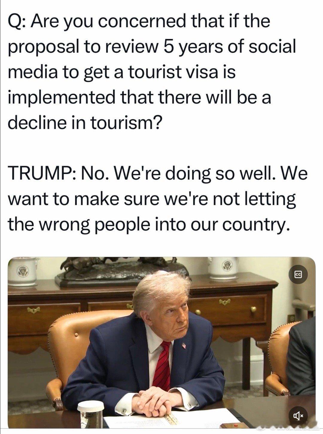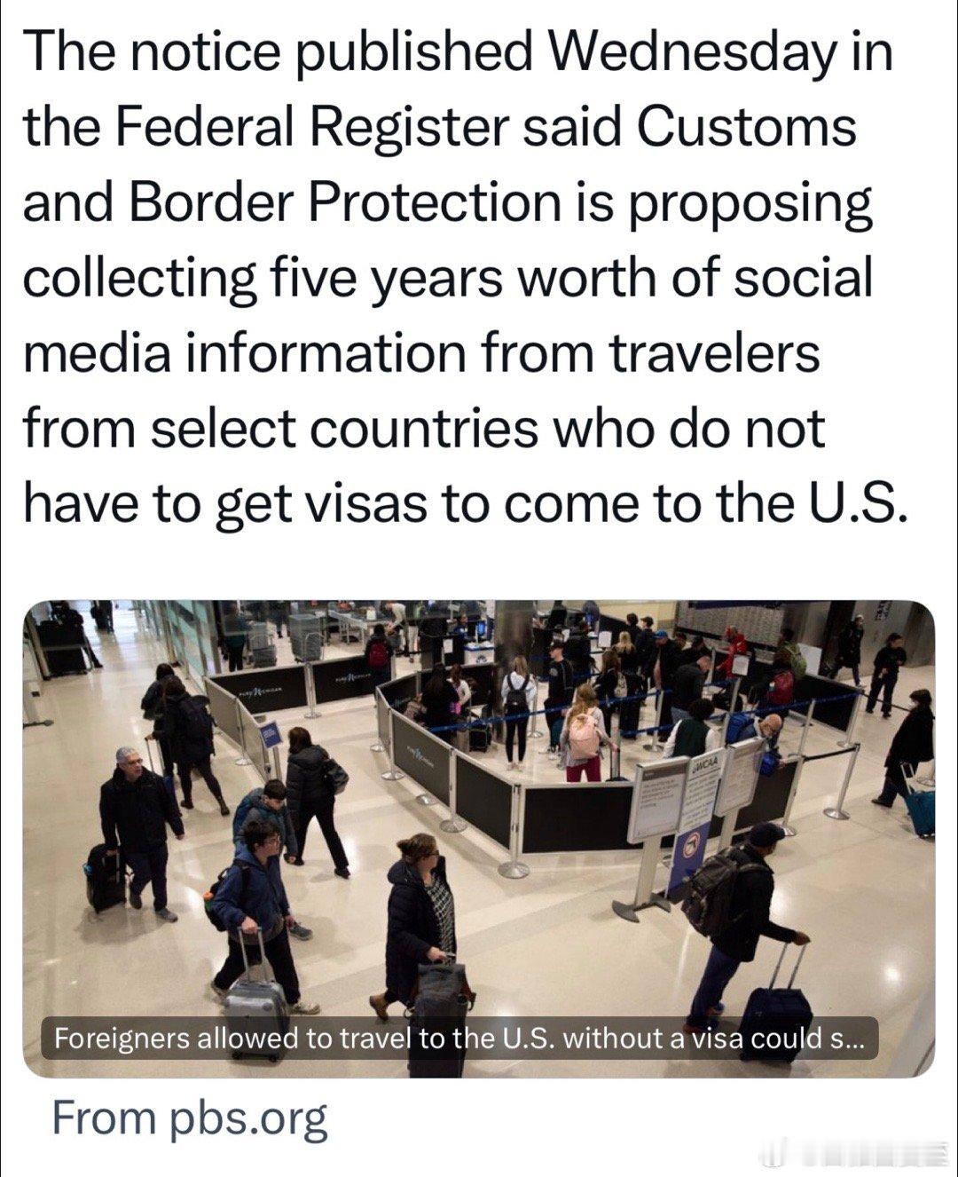 海关及边境保护(CBP)提案:现在不需要办签证的外国人,入境时应被查五年社交媒体内容- 适用“九十天免签”项目(VWP)的四十多个国家- 目前是提案,何时实施待定记者:不担心影响旅游业吗总统:不担心,旅游业很火,不能让错误的人进来注:需要办签证的,早已开始查;这是针对英法德日韩澳新等地免签公民