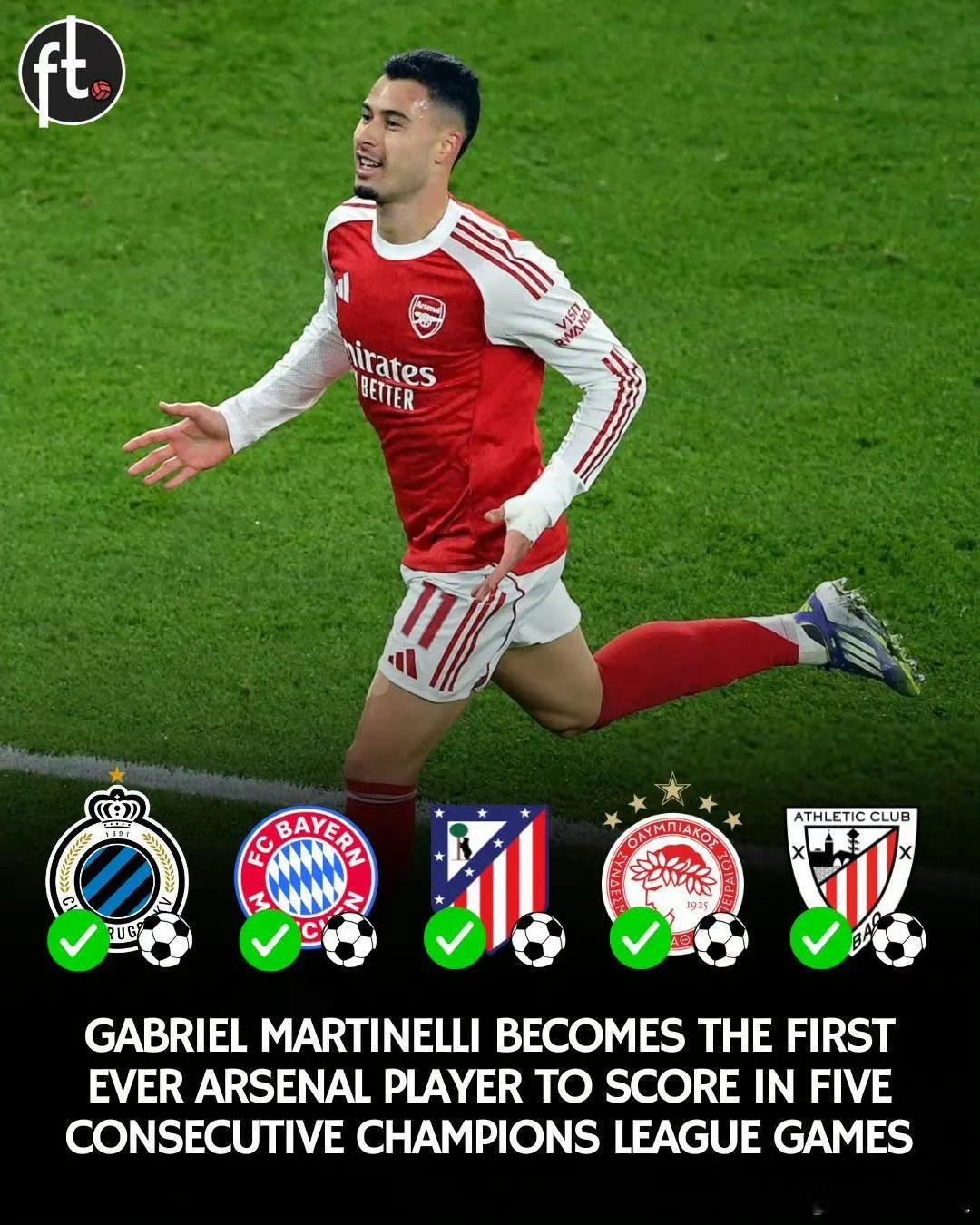 加布里埃尔·马丁内利成为阿森纳队史上首位在欧冠连续五场比赛中进球的球员。本赛季他代表阿森纳在该项赛事中出场五次,5场比赛全部取得进球:⚽ 对阵布鲁日 🇧🇪⚽ 对阵拜仁慕尼黑 🇩🇪⚽ 对阵马德里竞技 🇪🇸⚽ 对阵奥林匹亚科斯 🇬🇷⚽ 对阵毕尔巴鄂竞技 🇪🇸
