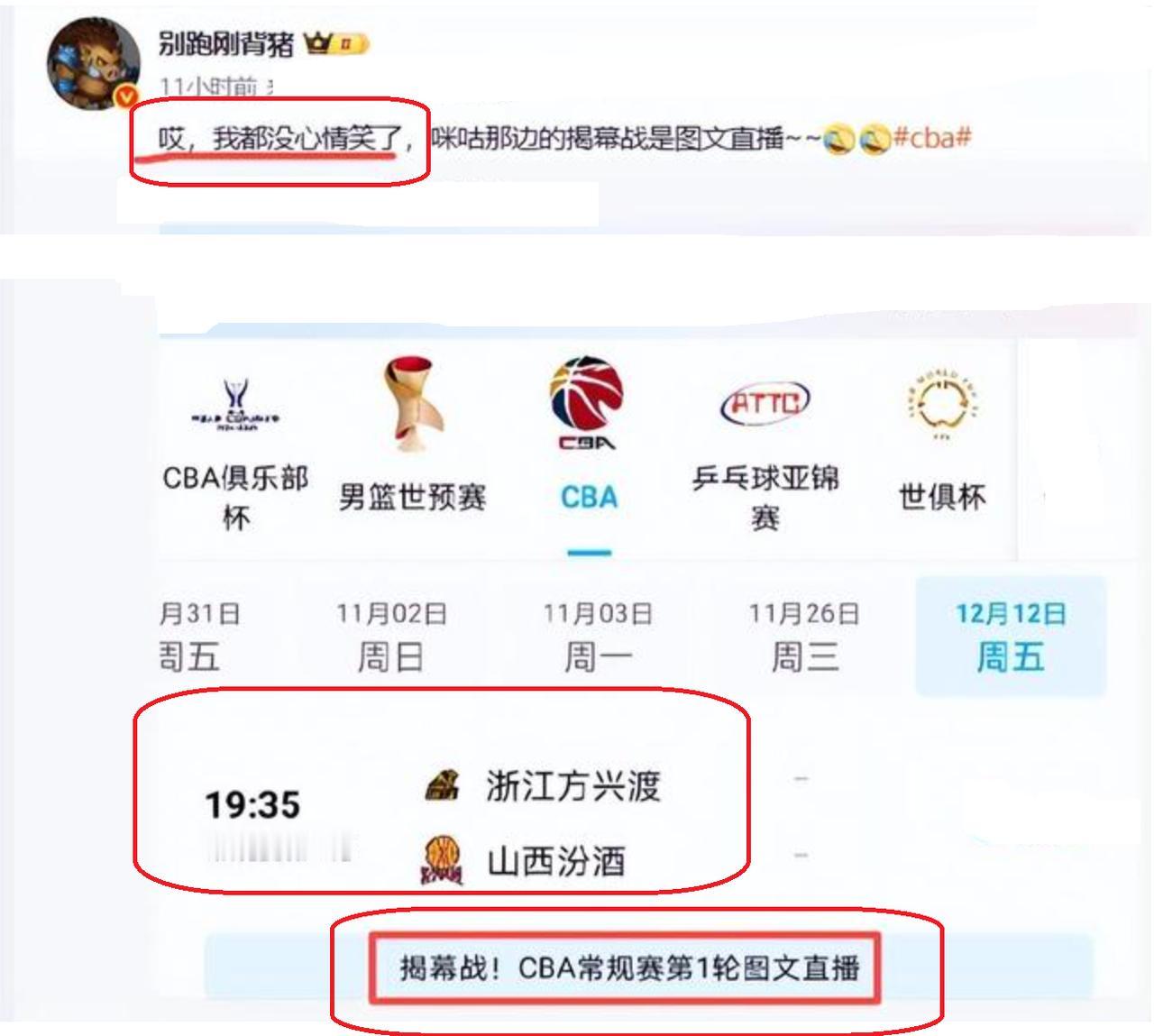 失望!CBA揭幕战图文直播,名记吐槽:我都没有心情笑了…… CBA新赛季马上就要开打,根据时间安排,12月12日,CBA揭幕战广厦队VS山西队的比赛,将会正式打响。然而,有一件事却困扰着球迷,到哪里看球呢?到哪里观看比赛呢?到现在依然还是一个谜! 根据了解,在过去五年直播CBA比赛的咪咕体育,目前就版权之事,依然没有和CBA公司谈妥。双方的价码依然没有达到一致!根据篮球媒体人透露,过去5年时间里,咪咕给CBA公司20亿五年的转播费用,然而,5年经营下来,非但没有赚到钱,还亏了不少。为此,此番只给CBA公司开出5年7亿的合同。这个报价,没有得到CBA公司的认可。双方经过一番商谈之后,咪咕开出了5年10亿的筹码,但是,这样的报价,依旧没有得到CBA公司的同意。 有CBA公司管理人员表示:CBA联赛是国内独一档的篮球比赛,不愁卖! 然而,到现在为止,并没有给咪咕开价更高的体育平台给CBA公司报价,而,咪咕报价,CBA公司却看不上,这就导致CBA联赛马上开打,却没有新媒体进行直播,不得不说,这也是一件十分尴尬的事情。 在咪咕体育平台上,我们可以看到直播方式为:图文直播! 就是说,现在双方依然是没有谈好,CBA没有网络直播! 看到如此情况,CBA篮球记者“别跑刚背猪”,也是忍不住吐槽:看到图文直播,我都没有心情笑了……想一想只有图文直播,还是多么久远的事情了,10年前,15年前,没想到,现在是倒退回去了…… 实话实说:从CBA直播版权如此纠结之事,我们也可以从侧面理解,现在CBA公司在经营管理方面,存在很多问题,存在很多漏洞。对于这样的事情,正常情况,应该在合同快要到期前一年就应该敲定的事情,现在比赛前一天都还没有确定,就算是现在确定,也来不及准备了吧! 显然,CBA公司此番做法,让球迷感到失望了。 (注:央视体育频道,会对CBA揭幕战进行电视直播!)