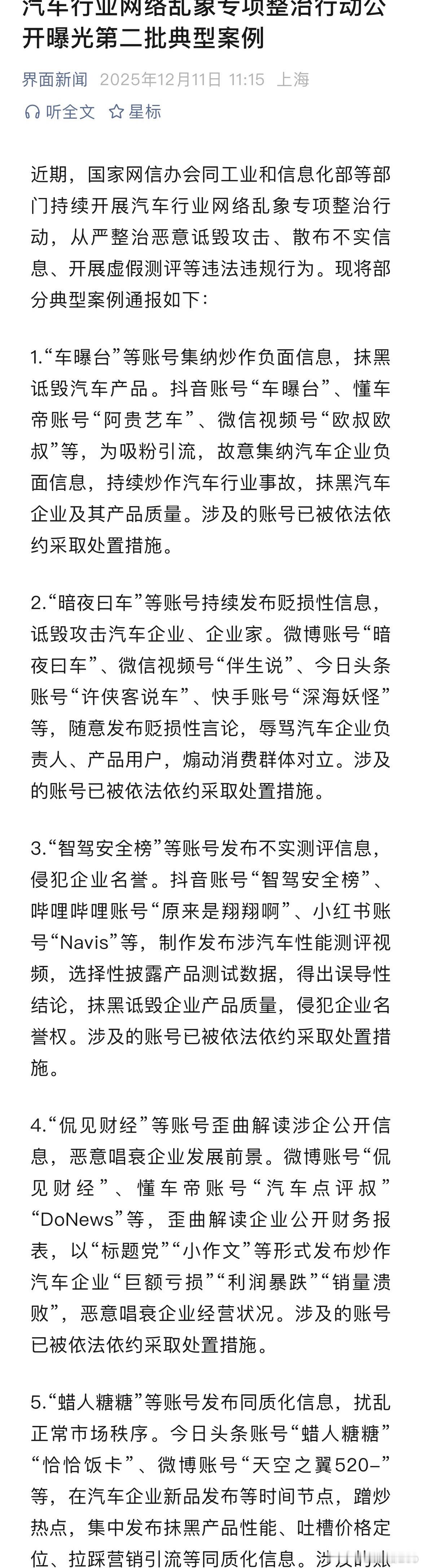 据网信中国公众号11日消息,近期,国家网信办会同工业和信息化部等部门持续开展汽车行业网络乱象专项整治行动,从严整治恶意诋毁攻击、散布不实信息、开展虚假测评等违法违规行为。汽车行业真是严打啊。好好做内容,不要乱喷。全网热点共创计划网信通报第二批被处置的汽车自媒体 一批恶意抹黑汽车企业账号被处置