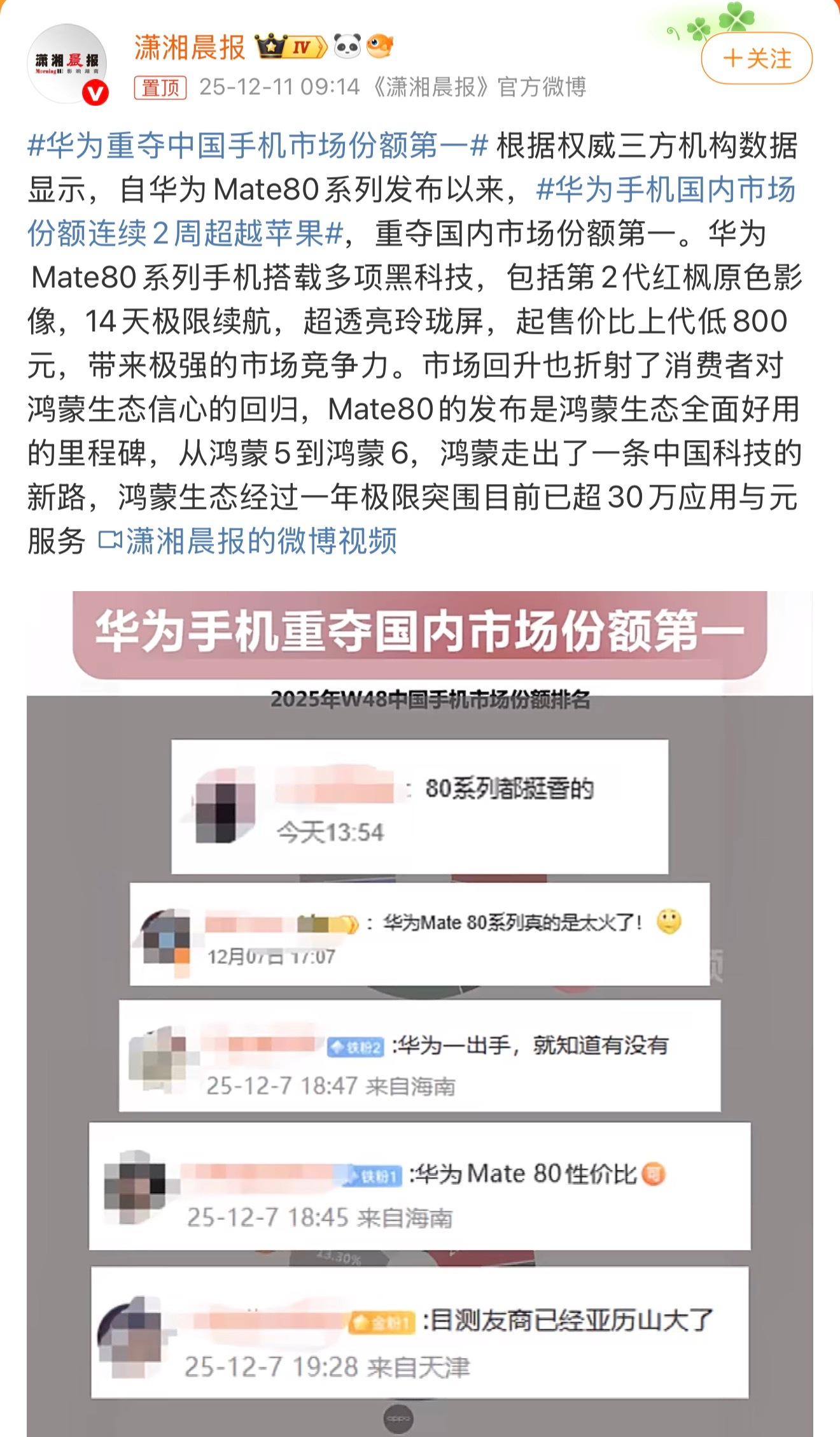 华为重夺中国手机市场份额第一数据好像跟其它来源都出入,之前看到的是华为mate80系列刚上市那一周因为只卖了三天,所以那一周没有拿到第一,不过从这个数据来源来看,华为应该都是第一。有一说一,谁也别在营销上装清高,之前营销市场第一都是按季度来的,现在变成周了,不做上热搜的另说。最后,汽车周榜不让弄了,手机周榜是不是也不让发了?老张聊科技