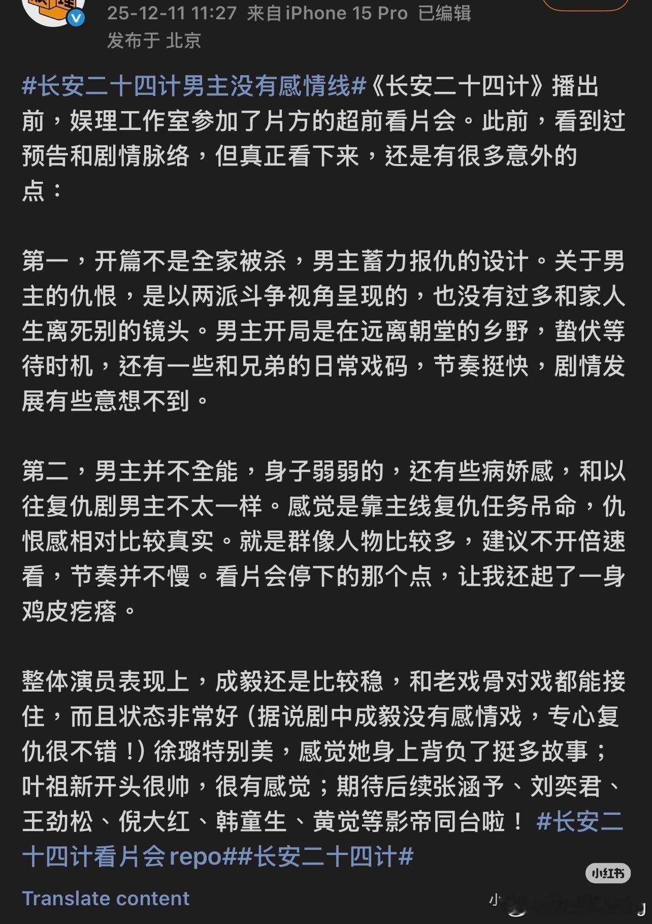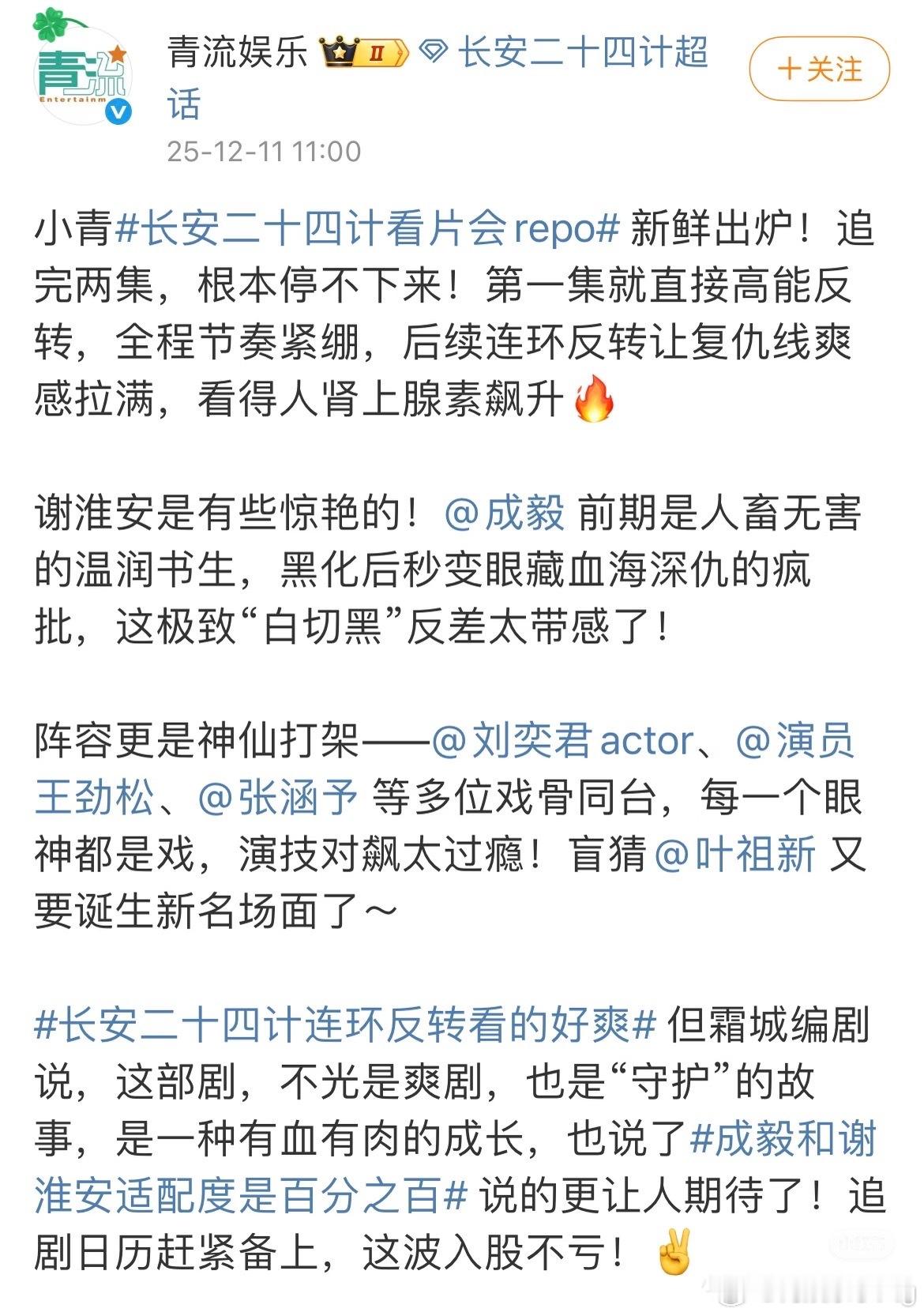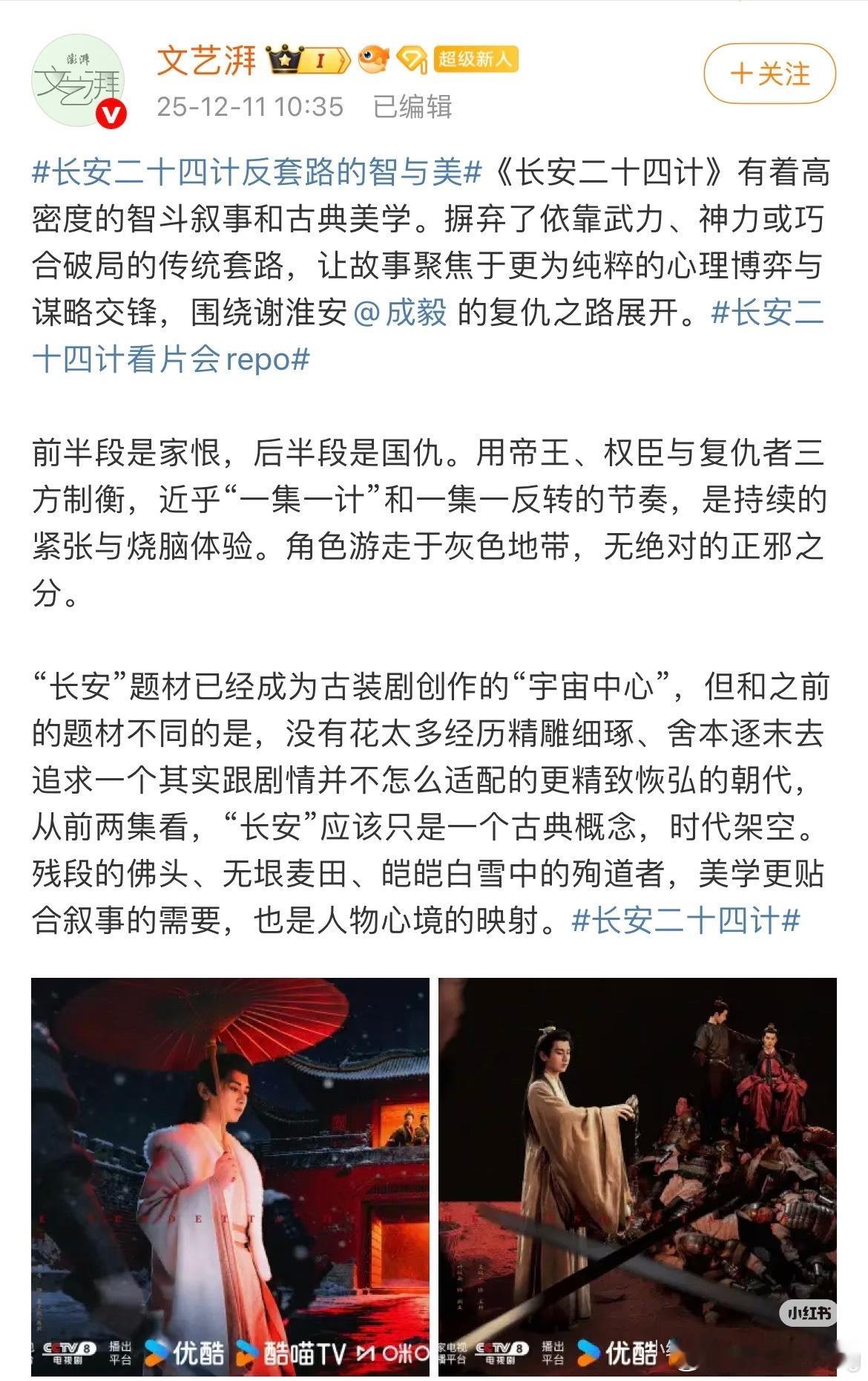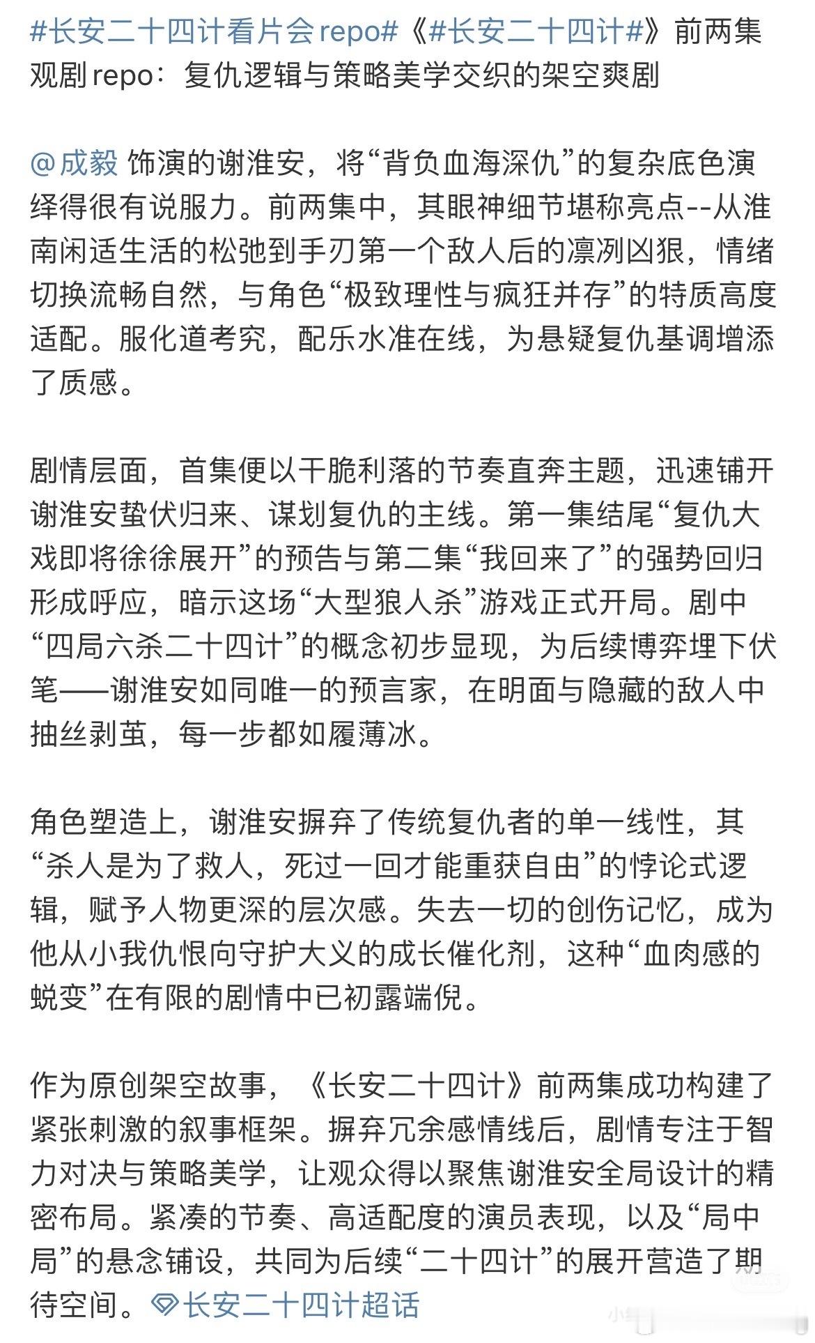 前两天媒体提前看长安二十四计,今天陆续开始出repo了…结合今天这版的预告,看得我心痒痒…我太爱这种反转再反转,复仇爽感类型的剧了…不止是剧情反转 演员也反转ie搞的剧宣也把人吊成翘嘴儿了…“披荆斩棘的爷爷”“失去武功的成毅”“深夜街头惊现大爷互殴” 太会整活了,我笑抽…长安二十四计