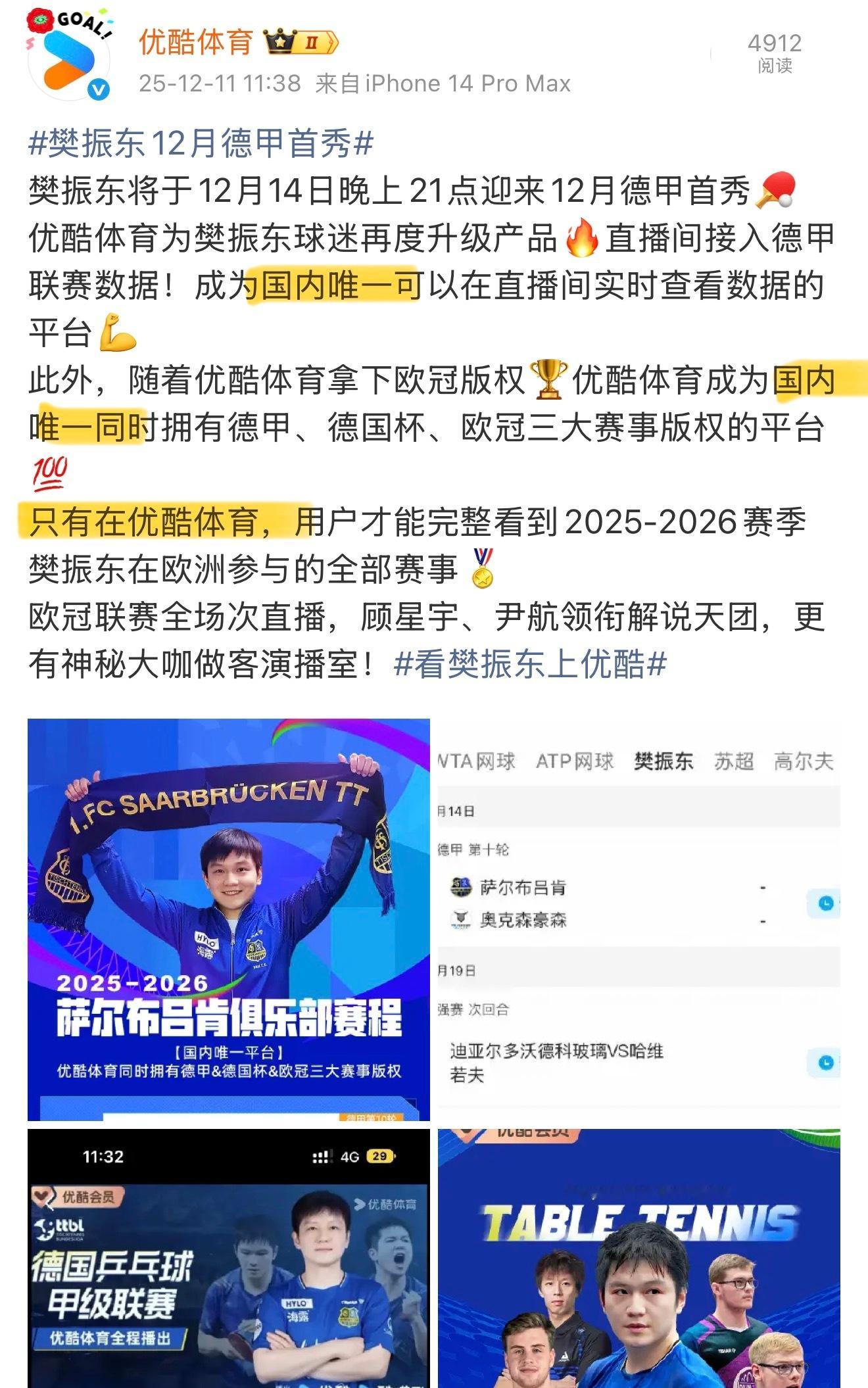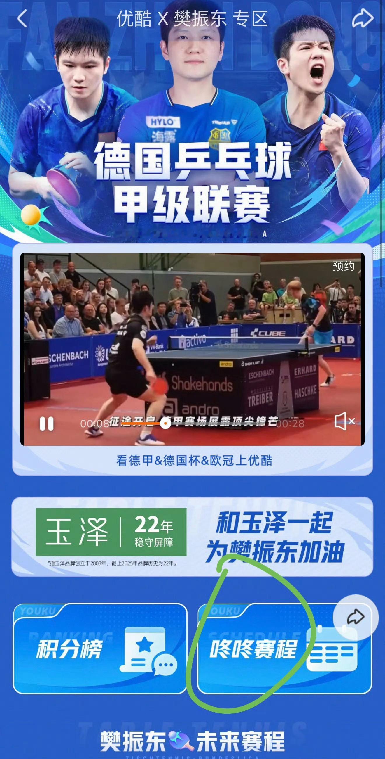 被这个优酷笑死了,好多“国内唯一”“只有”,还搞了个“樊振东专区”和“咚咚赛程”。樊振东12月德甲首秀