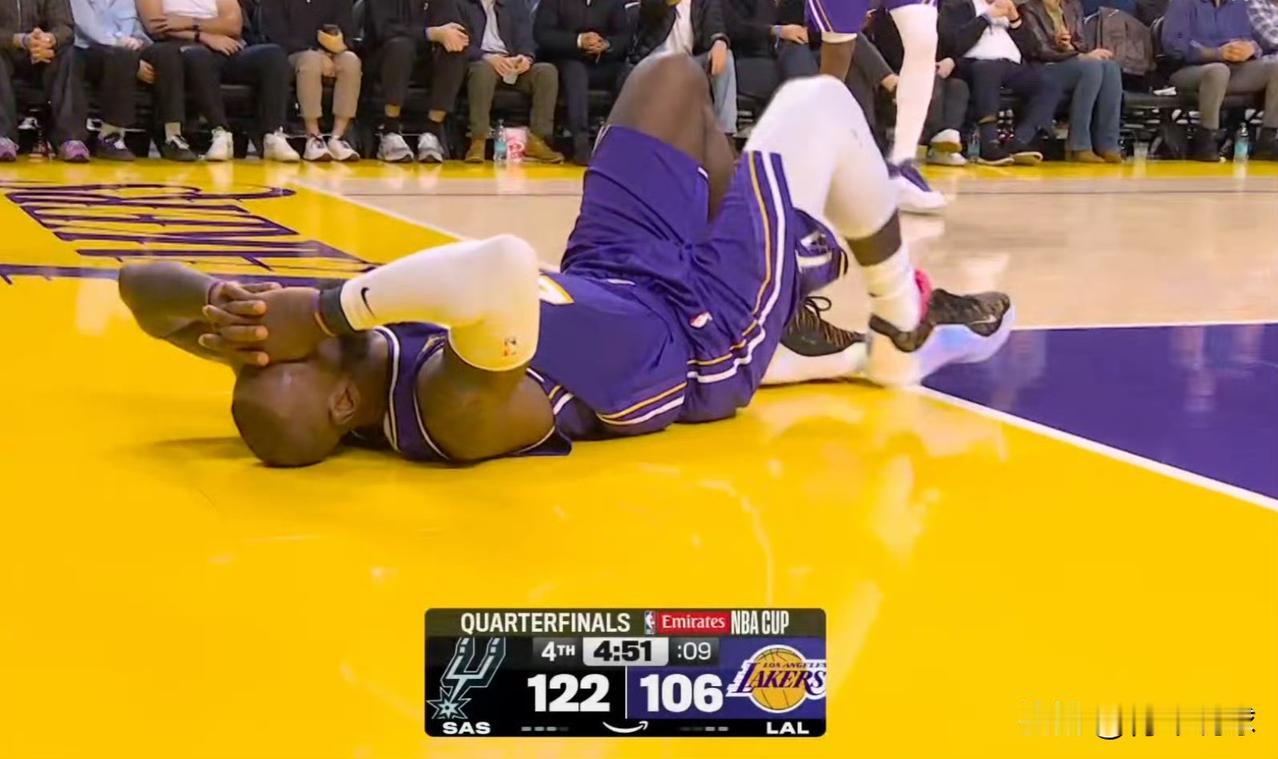 不放弃!詹姆斯让人动容! 第四节4分51秒,湖人队已经落后多达16分,但由于是NBA杯淘汰赛,他们依旧没有轻易放弃比赛,尤其是詹姆斯,他依旧在不断的冲击内线,在篮下点飞防守上篮过程中被对手重重打到头部,倒在地上表情非常痛苦,久久未能起身,这一幕让人动容。