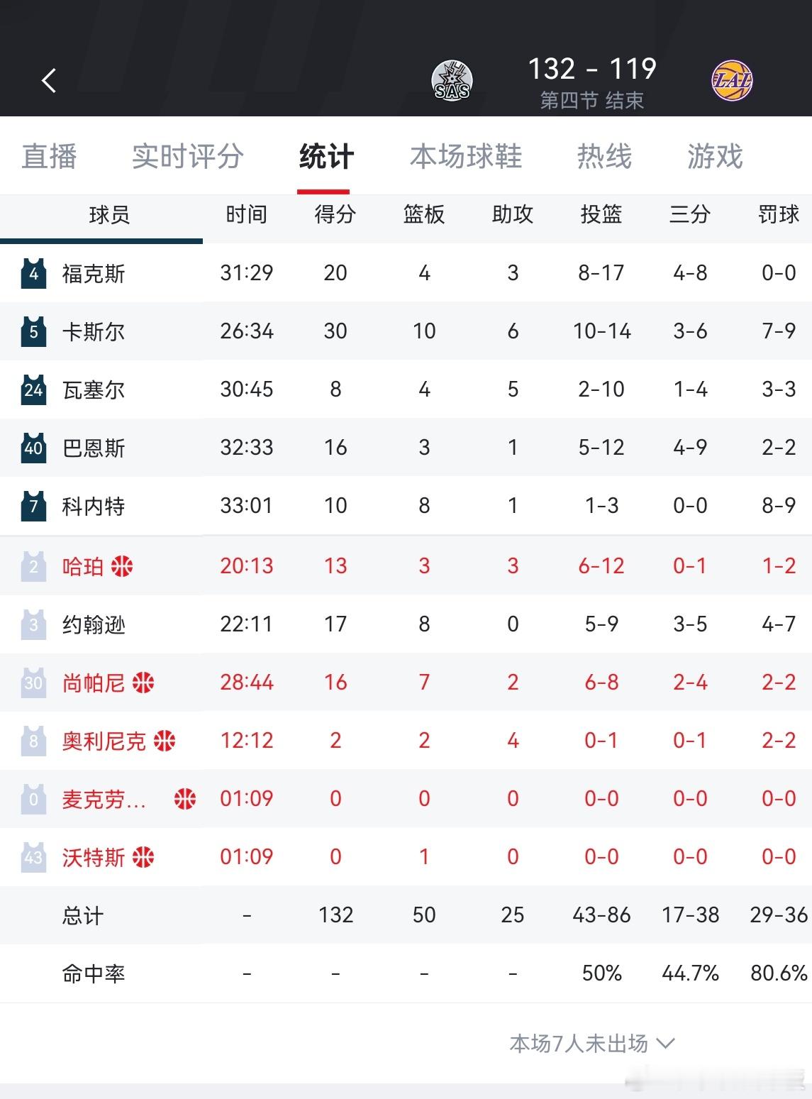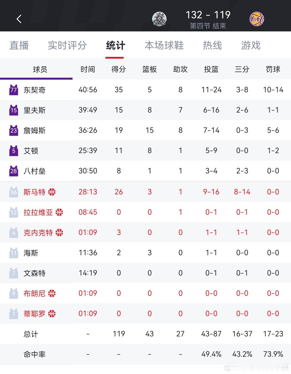 湖人119-132不敌马刺,杯赛出局。东契奇35分8助,詹姆斯19分15板,里夫斯15分,斯玛特26分马刺vs湖人