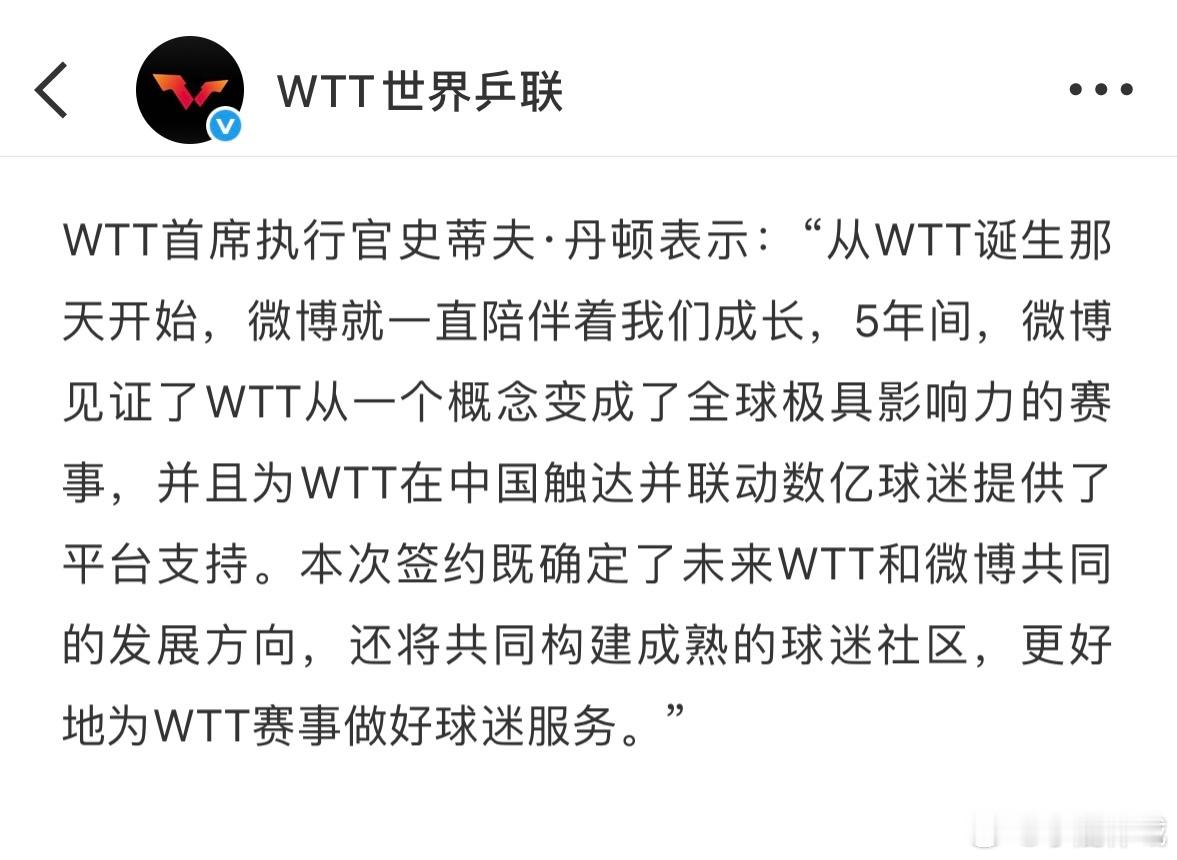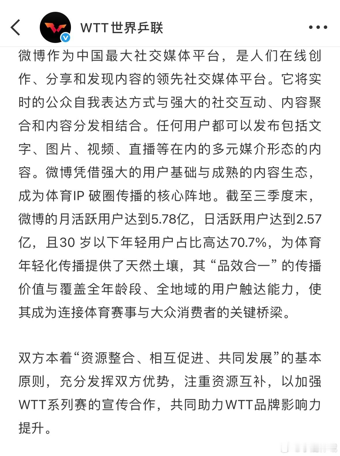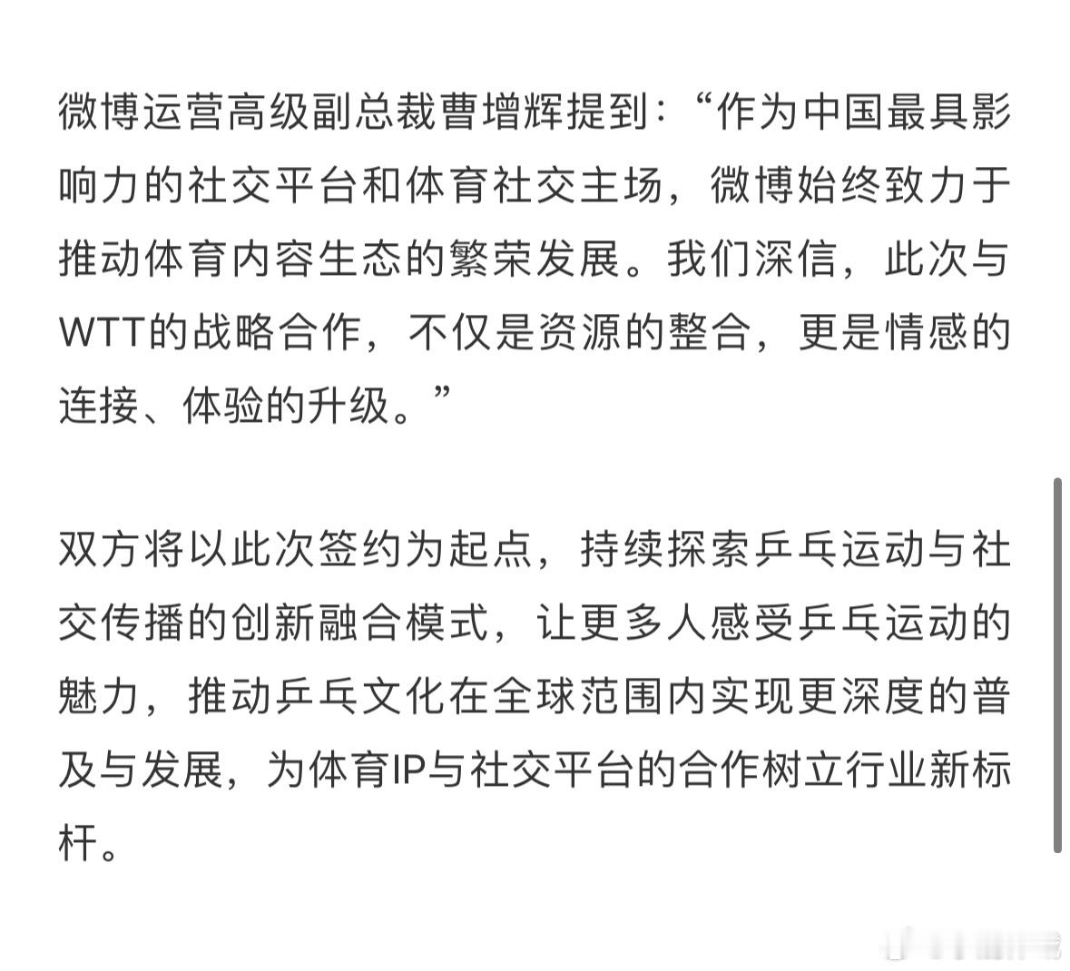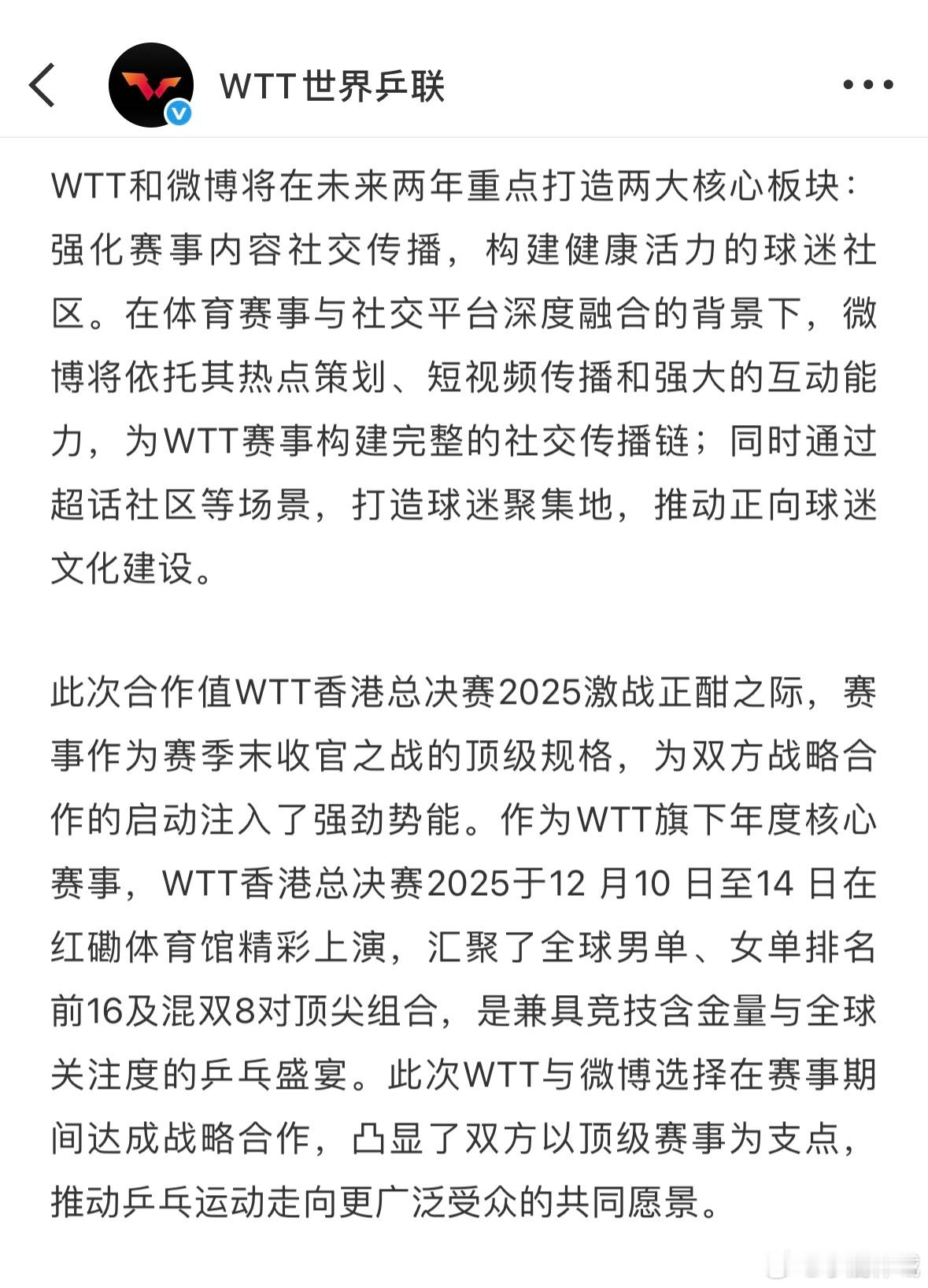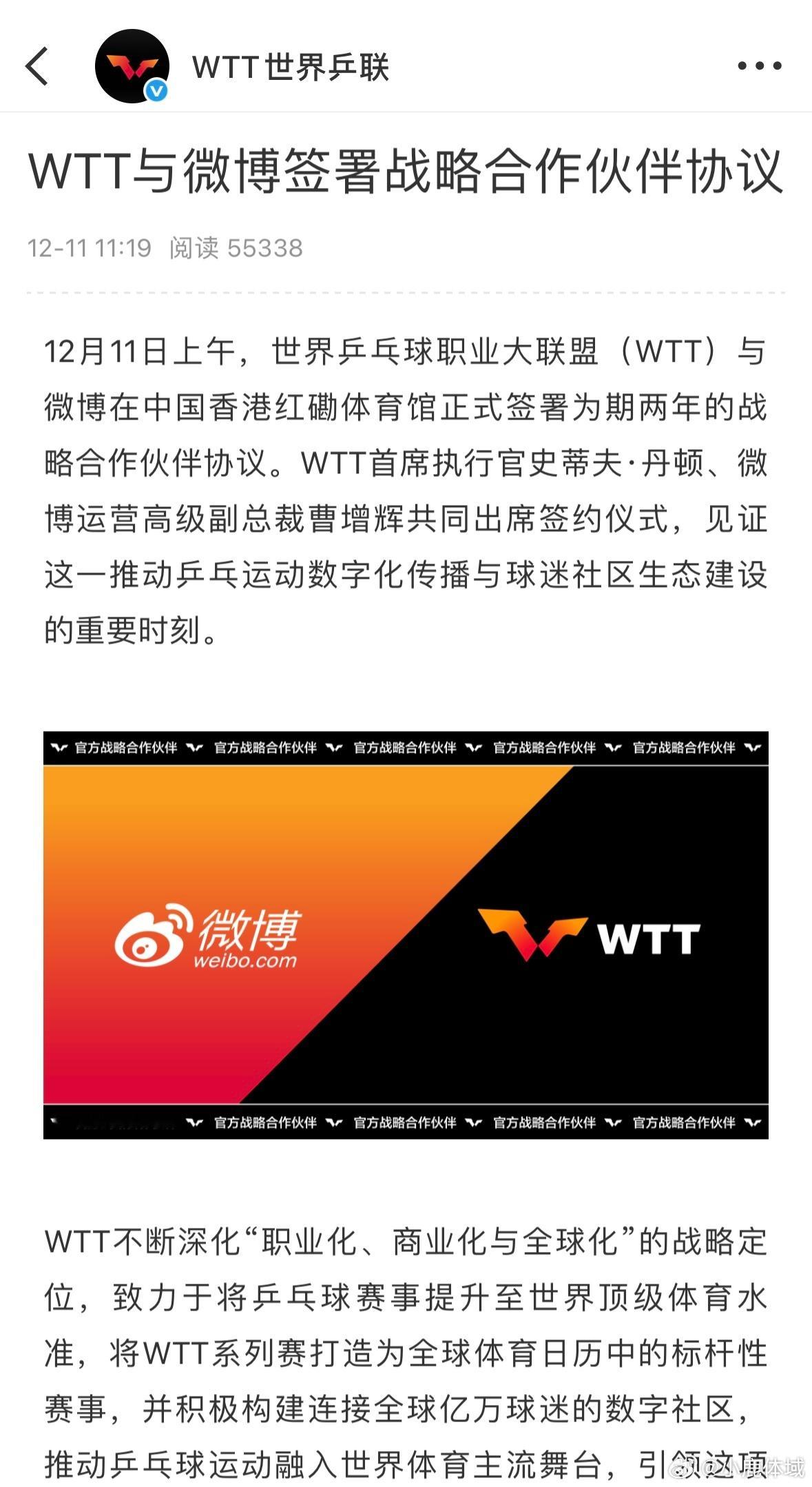 WTT与微博达成战略合作【WTT与微博达成战略合作】12月11日上午,世界乒乓球职业大联盟(WTT)与微博在香港红磡体育馆正式签署两年战略合作协议。WTT首席执行官史蒂夫·丹顿与微博高级副总裁曹增辉共同出席,携手开启乒乓球运动数字化传播与球迷社区建设的新篇章。合作将聚焦两大板块:强化赛事社交传播链与构建健康球迷社区。微博将依托热点策划、短视频与互动优势,结合超话等场景,打造乒乓爱好者聚集地。今日15:00起,合作专属开机画面已上线。期待未来两年,双方通过创新融合,为全球球迷带来更丰富的观赛体验与互动福利,推动乒乓文化广泛传播,树立体坛合作新标杆!