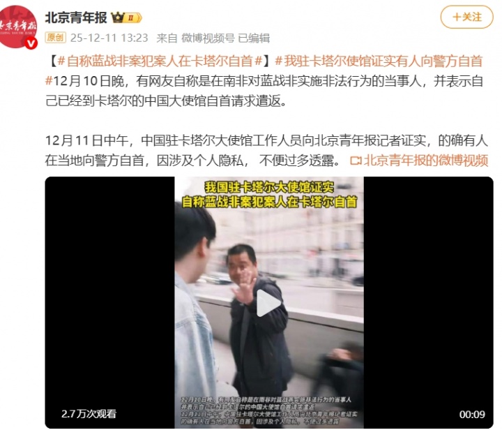 10日晚,新京报记者致电中华人民共和国驻卡塔尔大使馆,工作人员表示对此情况并不了解。“没有这样一个人到大使馆来自首。”