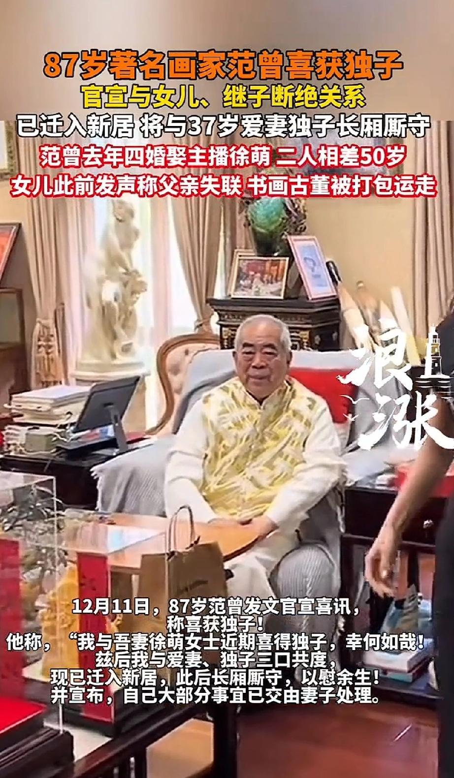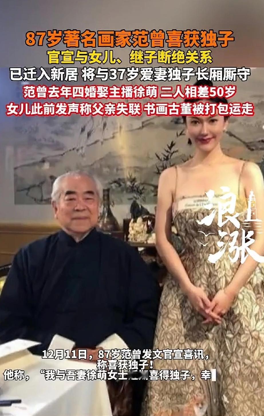 厉害啦!87岁的著名画家范曾喜得独子。 87岁的画家范曾与37岁的主播妻子徐萌年龄相差50岁。87岁还能生育,着实令人惊叹,让人不得不佩服。 突然忆起一个流传已久的笑话。医生问:你去打猎没开枪,老虎怎么会倒下?另一个医生说:那肯定是别人开的枪。 [赞]