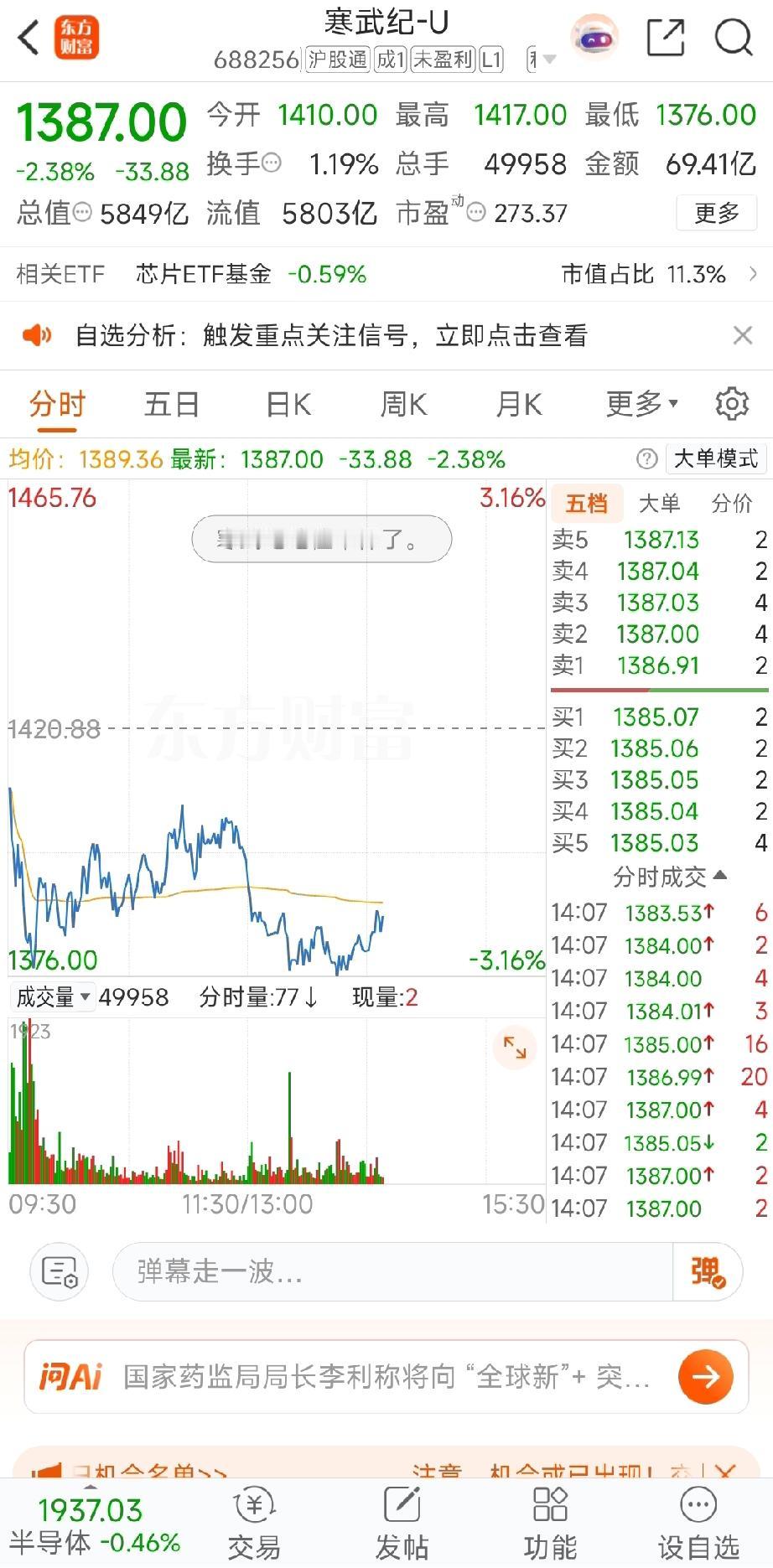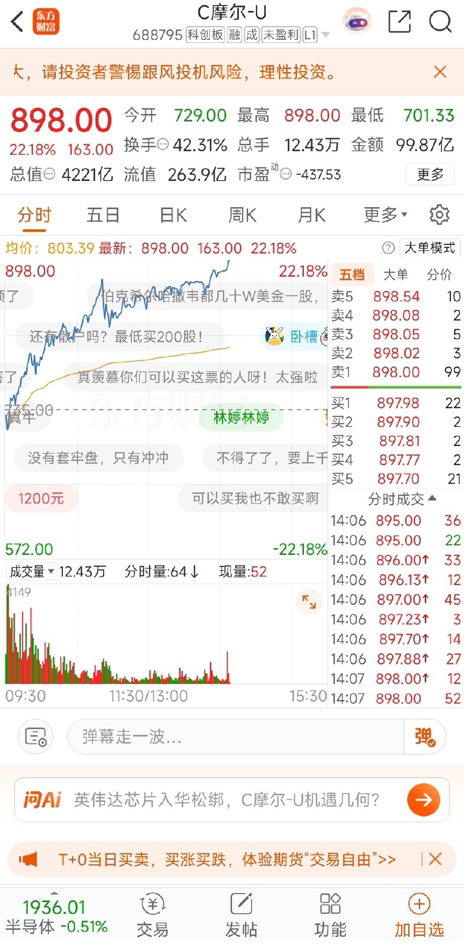 太残暴了!摩尔线程上市还不到一周,股价眼看就要冲到1000块了。截至今日,股价已大幅上涨22个点。原本预计半年才能达到千元,如今一周便可实现。如此一来,寒武纪“寒王”的地位怕是难保,不如改称“魔王”吧。