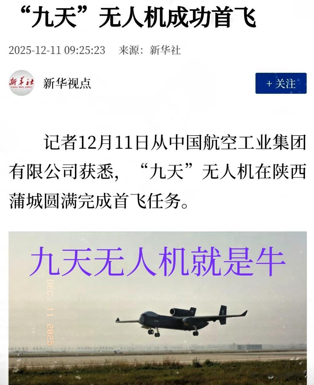 九天无人机首飞成功! 大家可能不知道九天无人机有多恐怖?它最大飞行高度15000米,最大飞行时速700公里,最大航程7000公里。 咱就说更硬核的,这架“空中巨无霸”机长16.35米、翼展25米,最大起飞重量16吨,光载荷就达6吨,比美国MQ-9死神无人机的最大起飞重量还多出11吨多。 绝的是,它的“异构蜂巢任务舱”,能装下上百架微型无人机,还能两小时快速换模块,运货、勘测、打击随时切换。8个外挂点能挂1000公斤制导炸弹、反舰导弹,攻防能力直接拉满。 实战中它的优势太明显,我打个比方。 比如它在远海对峙时,1.5万米高空巡航让敌方防空系统够不着,700公里时速能快速抵近,释放的无人机蜂群能瞬间压制雷达,就算是航母近防炮拦截率也不足40%,第一轮饱和打击就能瘫痪敌方关键设施。 这真的不是虚的,它是中方自主研发的全产业链成果,从设计到制造国产化率100%,首飞成功直接填补了大型军民两用无人机的空白。 这种“高空+高速+重载+蜂群”的组合,让对手根本没有辙,既打破了技术垄断,更给低空经济添了新动能,这款九天无人机是实实在在彰显了中方科技的硬实力。九天战机 九天无人机 九天重型无人机 九天无人战斗机 九天新型无人机
