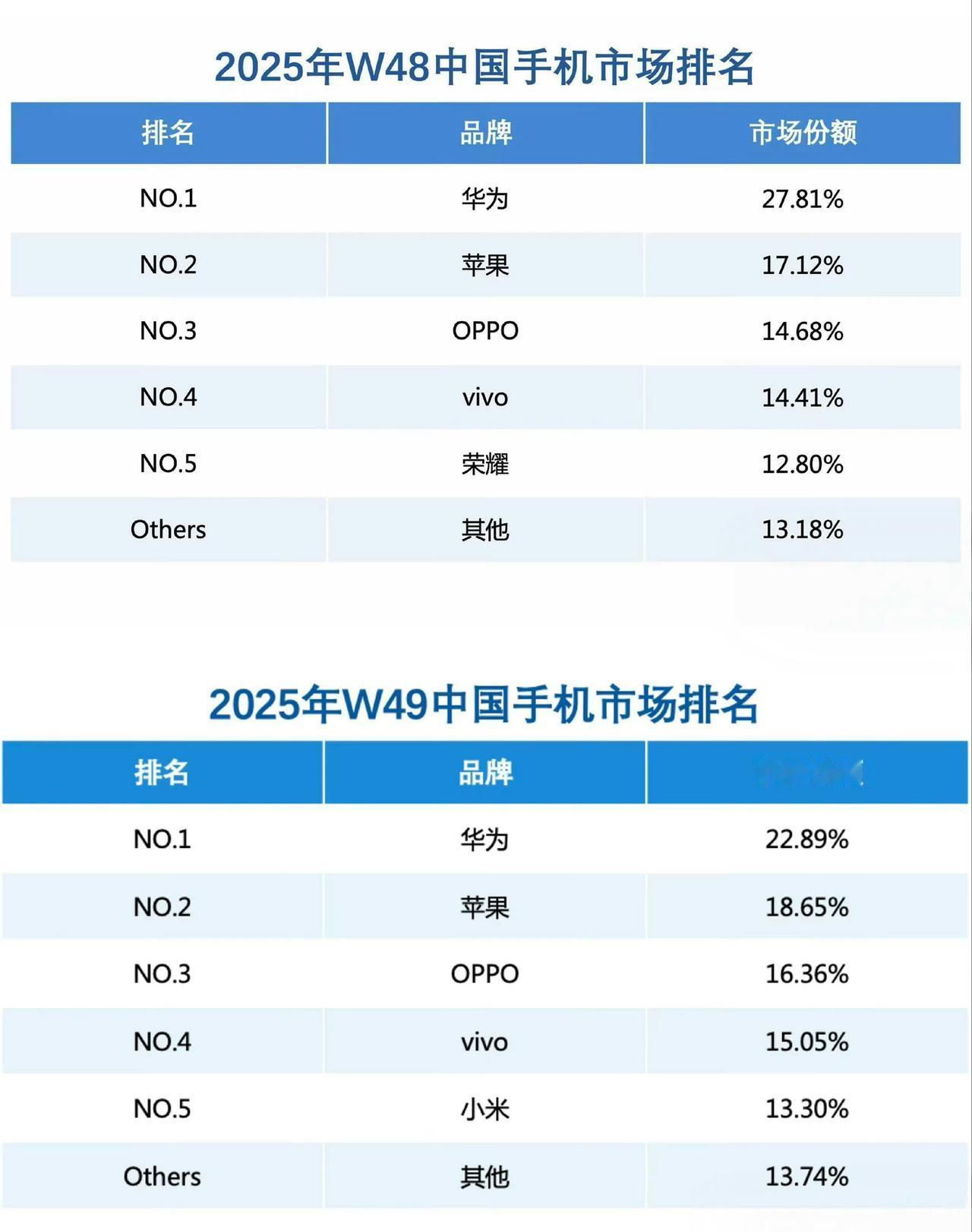 我们如果换个想法,在近期没有任何新品发布的情况下,小米手机市场份额在49周重回前五,是不是一件相当牛逼的事情?! 这段时间的小米一直在进行自我整顿,等小米后面再发布新品,重回前三是绝对概率事件。同时,也充分证明了,小米17 pro max绝对是经得起时间检验的产品,这段时间热度依然不减,背屏设计依然独占一方。