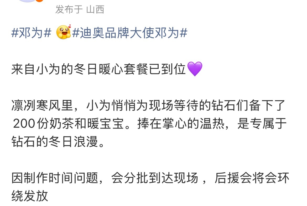 邓为迪奥活动逆应援 邓为今天迪奥活动逆应援为现场等待的钻石们准备了200份奶茶和暖宝宝。好贴心邓为逆应援送粉丝奶茶暖宝宝