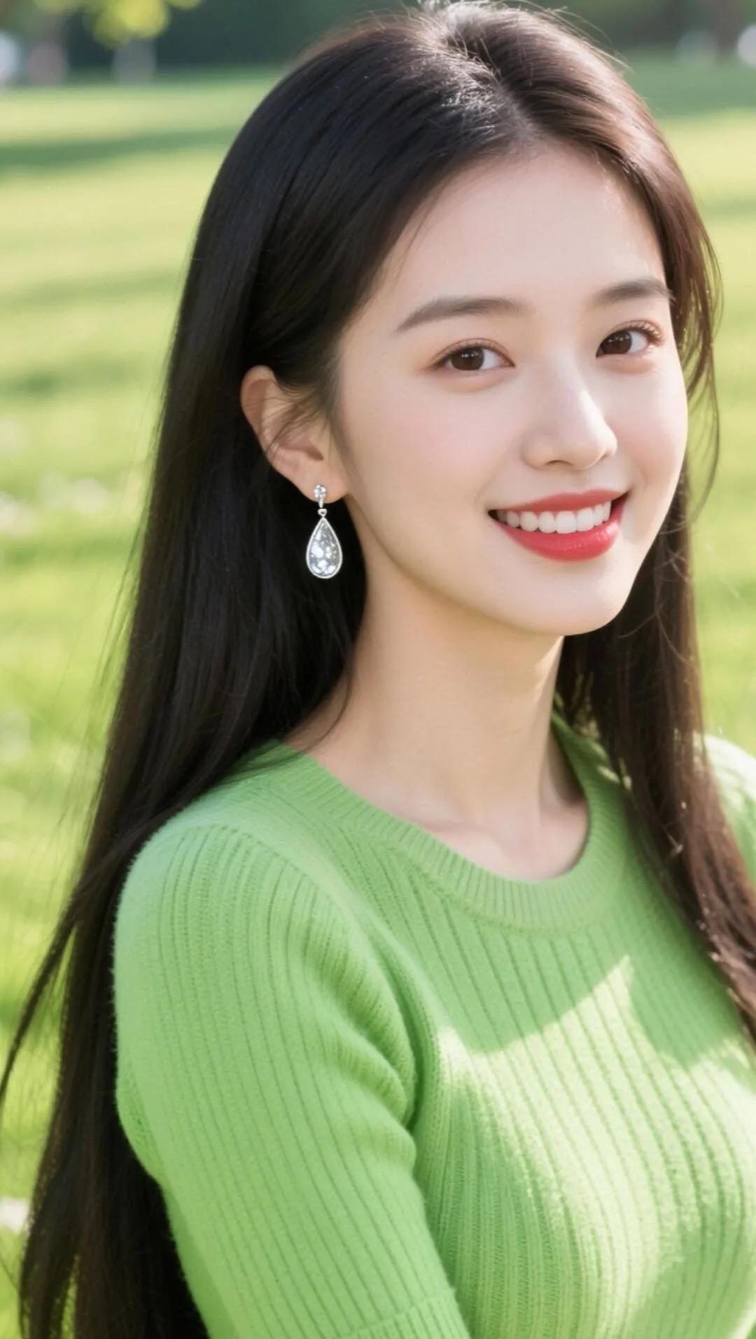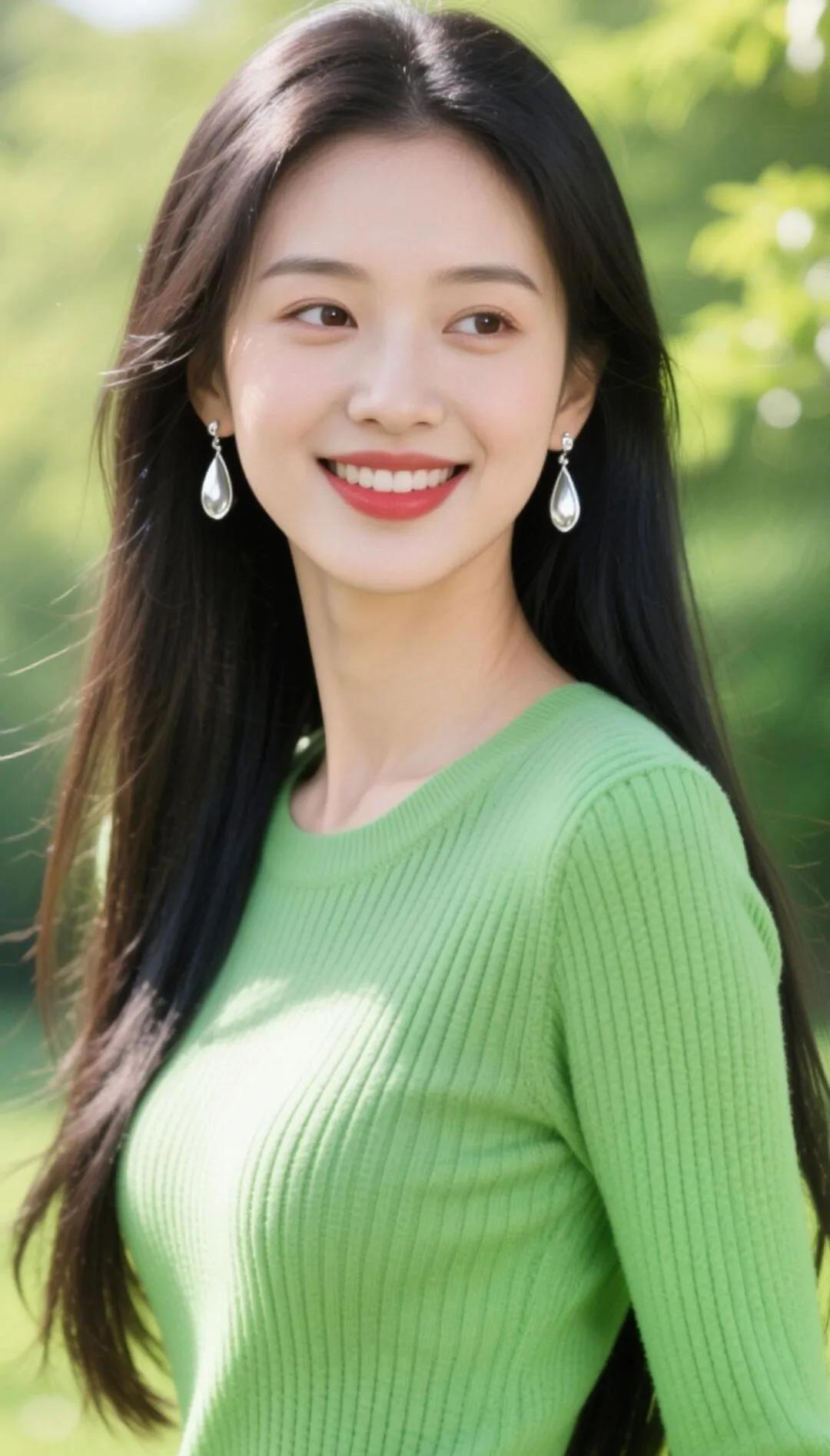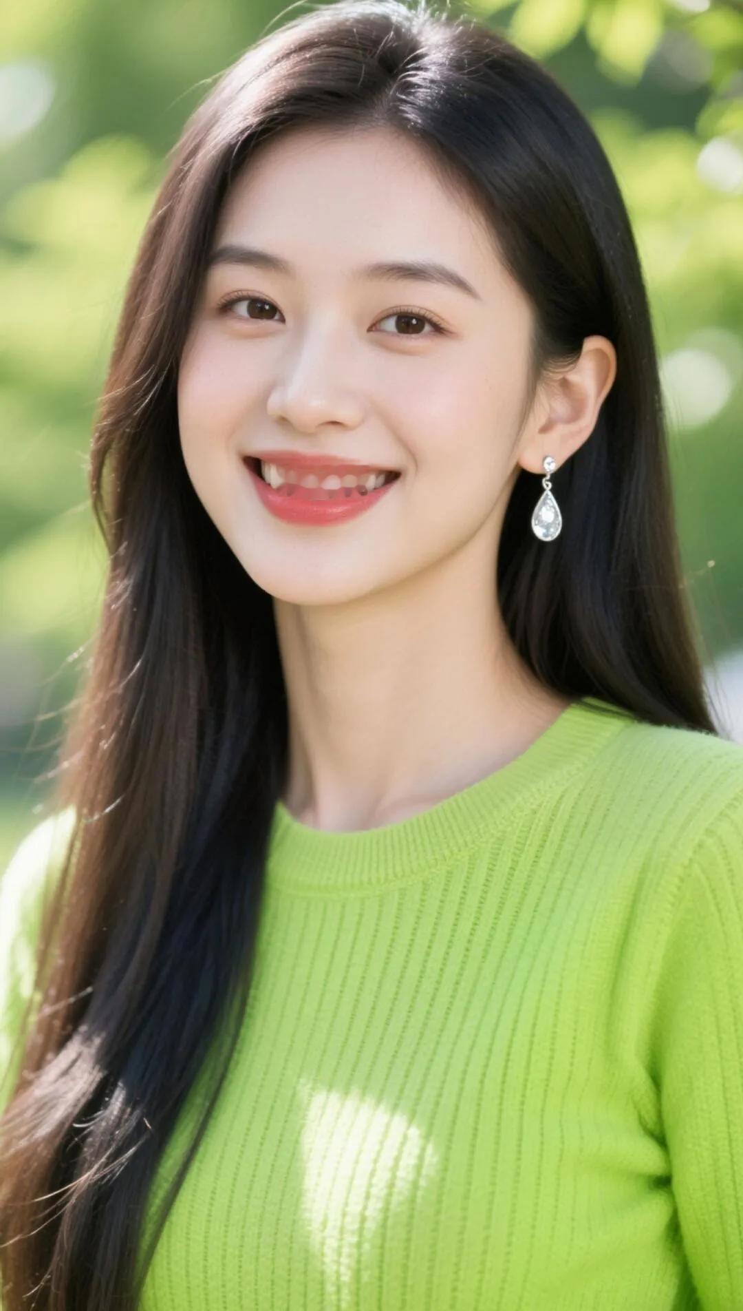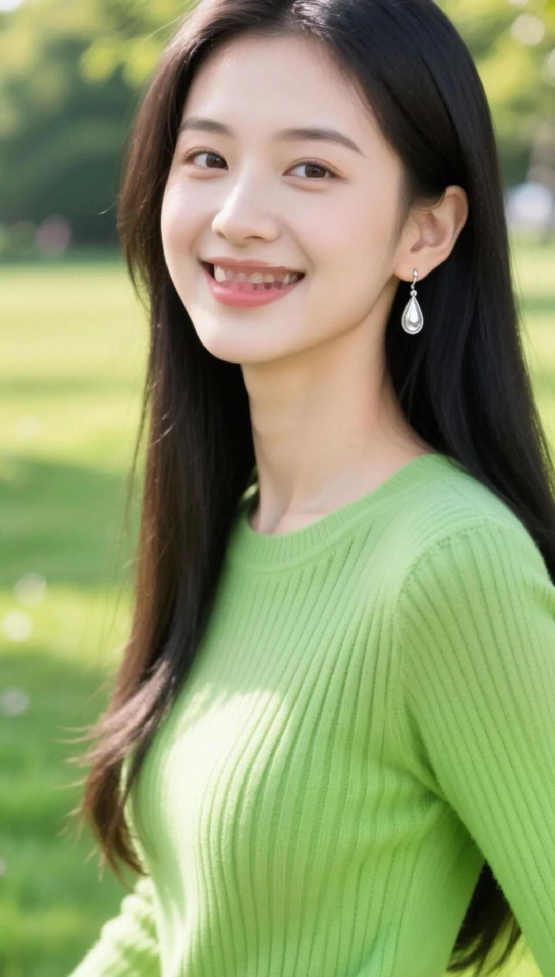 阳光明媚的午后,绿意盎然的公园里,一位微笑的姑娘,清新自然,如春风拂面。